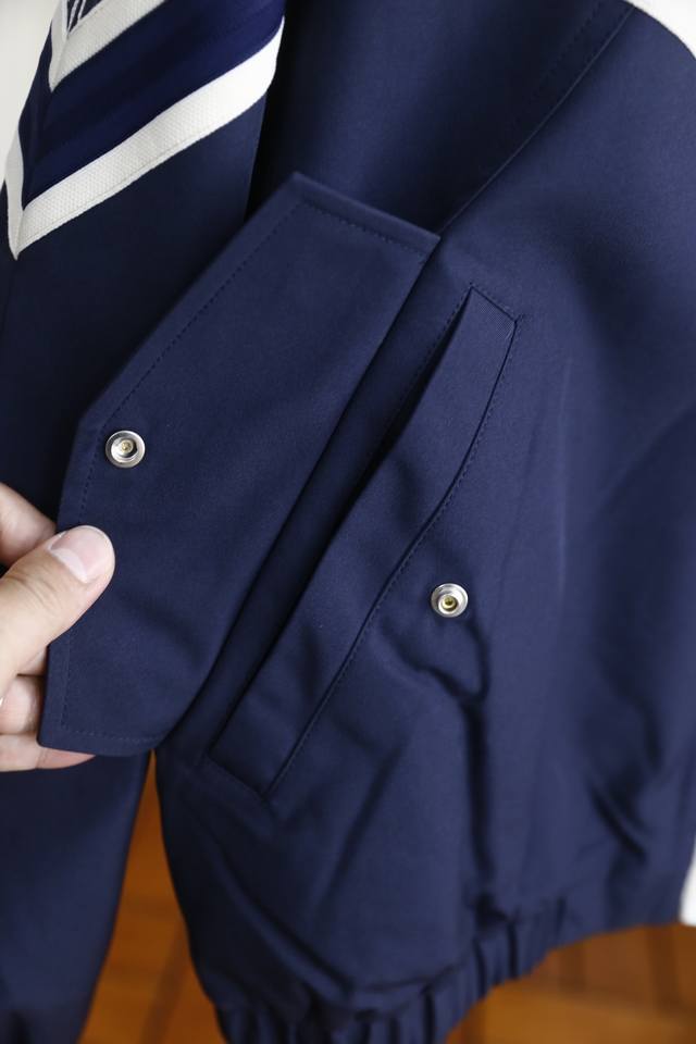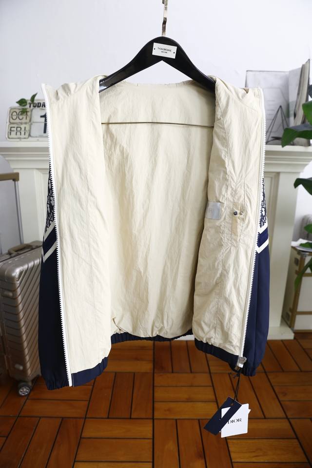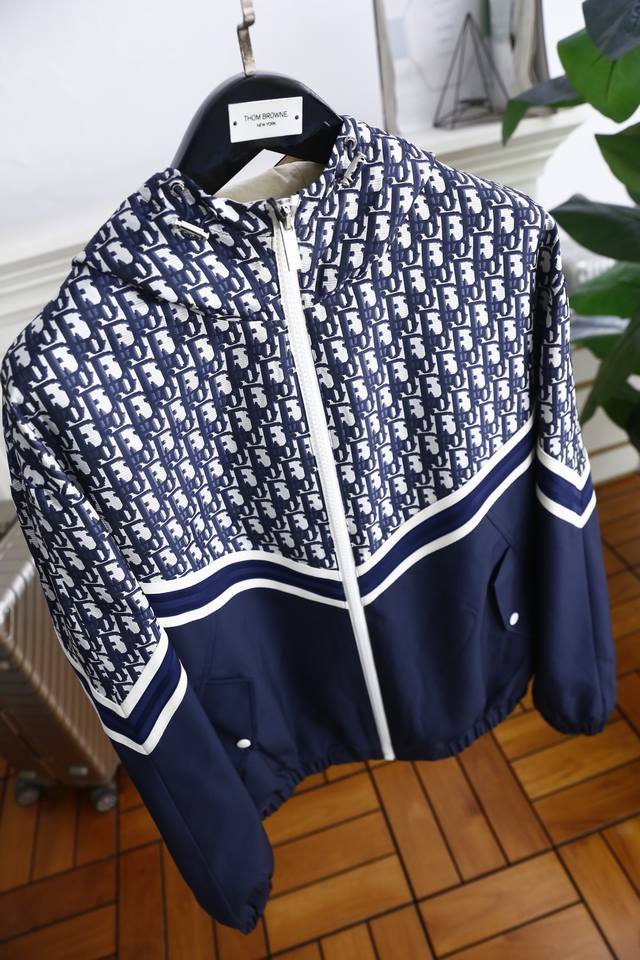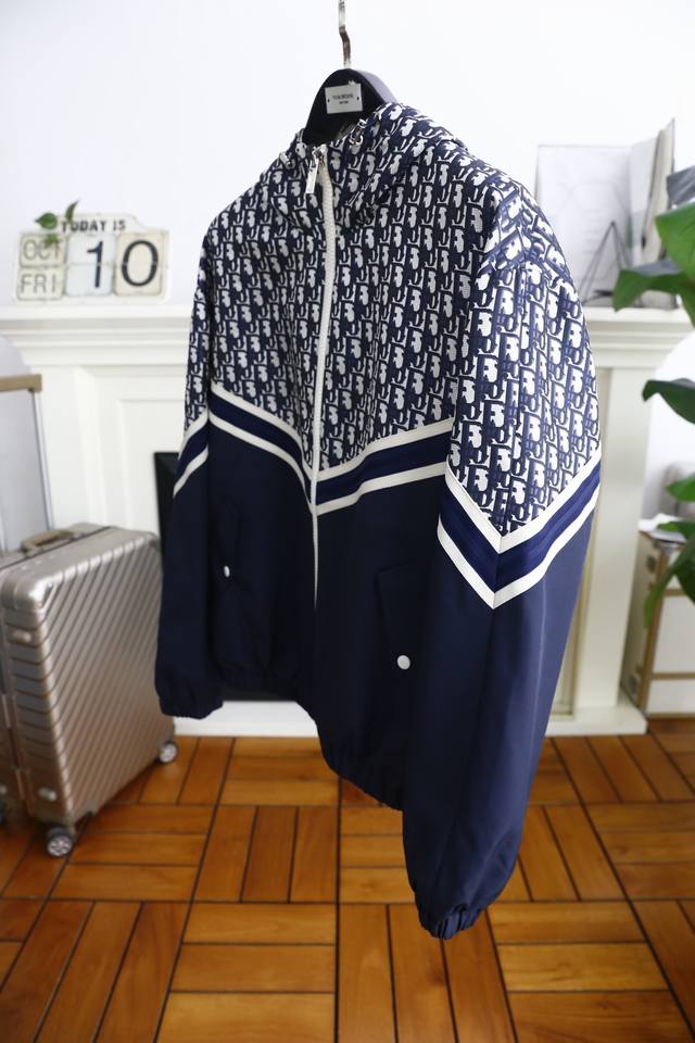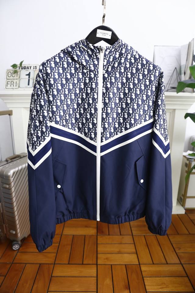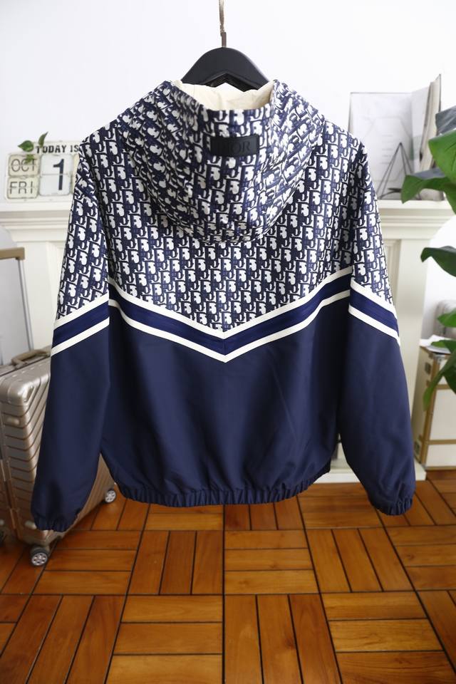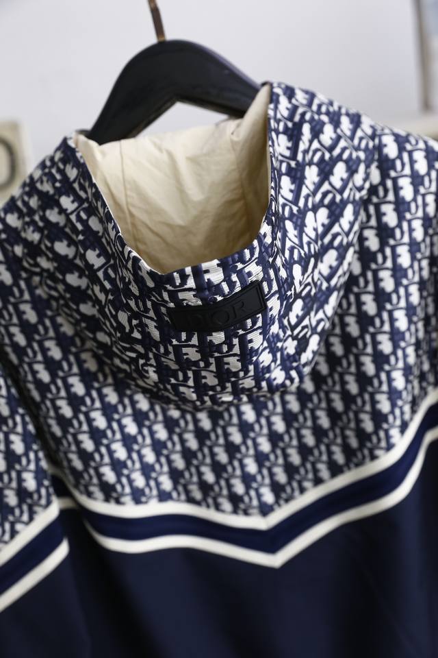 Di*R Dior Ddd 2025 Fall/Winter Men's Monogram Jacquard Hooded Jacket features a blue and white color scheme. The upper part of the jacket and hood area are covered with the brand's iconic "Cd" monogram jacquard pattern, a classic brand identifier that combines recognizability with a retro feel. The lower half of the jacket is made of pure navy blue fabric, paired with white and blue V-shaped stripes, and features side pockets and a drawstring hem, balancing design and practicality. Made of waterproof and windproof polyester fiber, the surface has a matte finish, making it smooth to the touch and easy to care for. The relaxed fit is perfect for casual outings and light exercise in spring and autumn. It can be layered with a simple T-shirt or sweatshirt, and paired with casual pants or sweatpants for a relaxed and stylish look. Sizes: 48-56, DDD