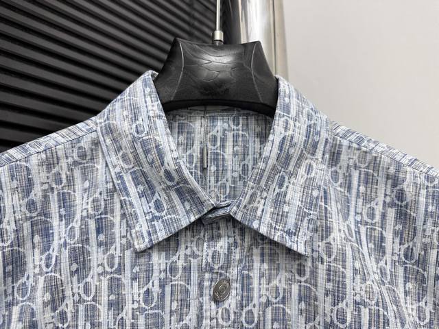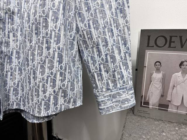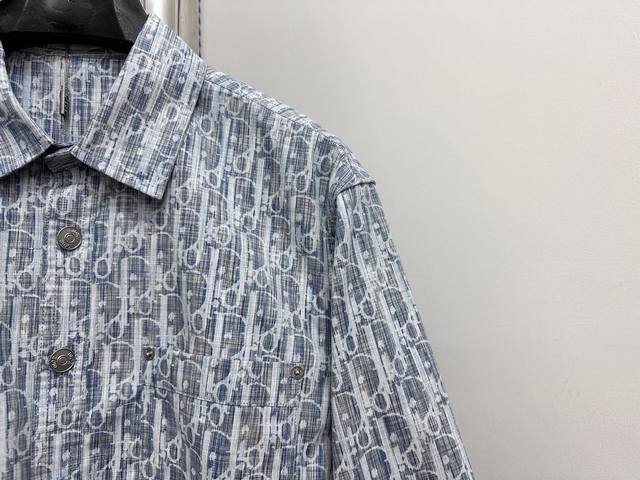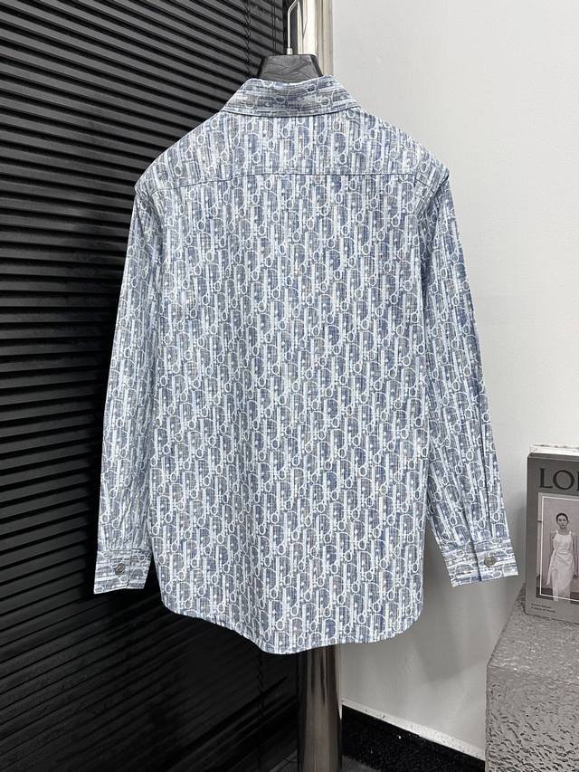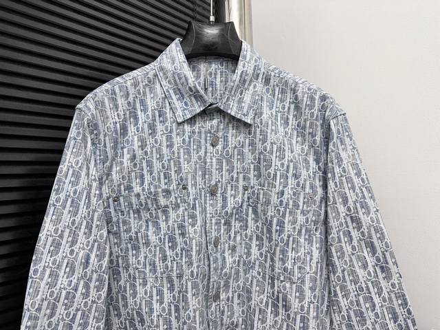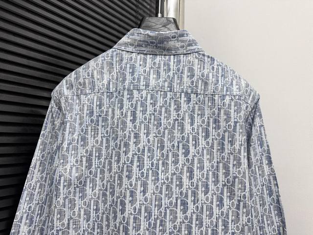 High-quality Dior monogram jacquard long-sleeved denim shirt. Features custom-made aluminum buttons that resist rust even after washing and long-term storage. The "Dior" lettering on the small buttons on the pockets is clearly visible. The lettering on the fabric uses a discharge printing process, which pulls the original yarn color to a white-gray, unlike the printed or jacquard fabrics on the market. The fabric has a thicker, stiffer feel, unlike the soft, lightweight materials found elsewhere. This difference is noticeable. The fabric is wrinkle-resistant, and the custom-dyed yarn perfectly replicates the original color. Sizes: 38, 39, 40, 41.
