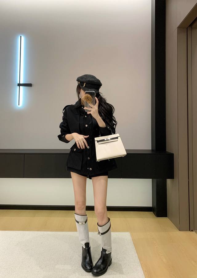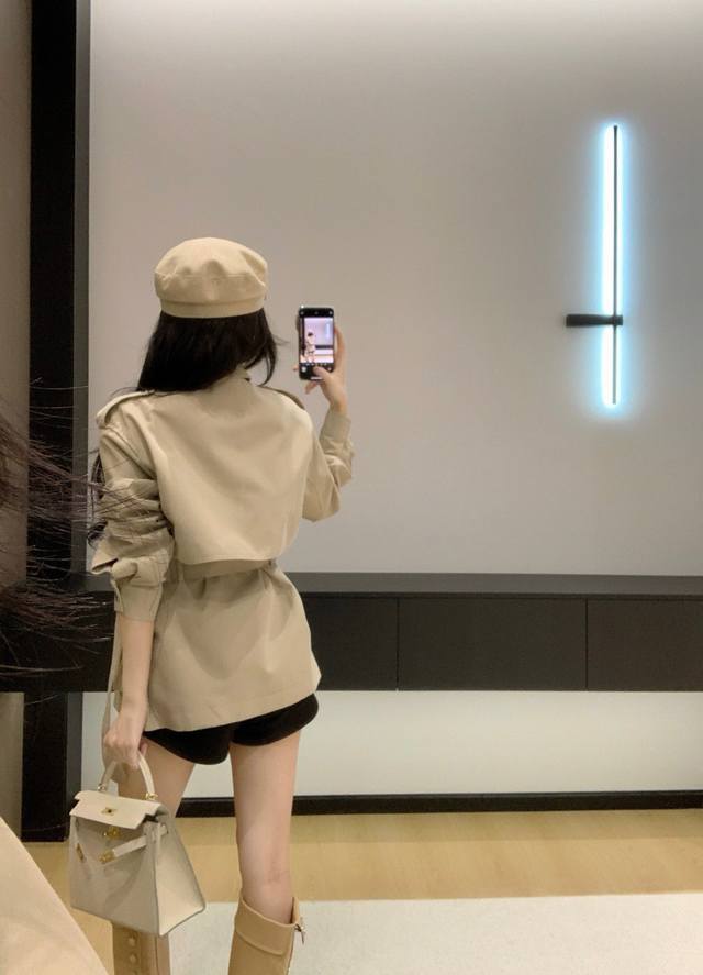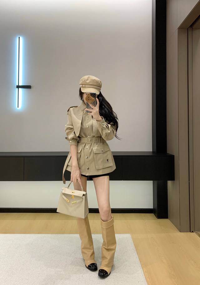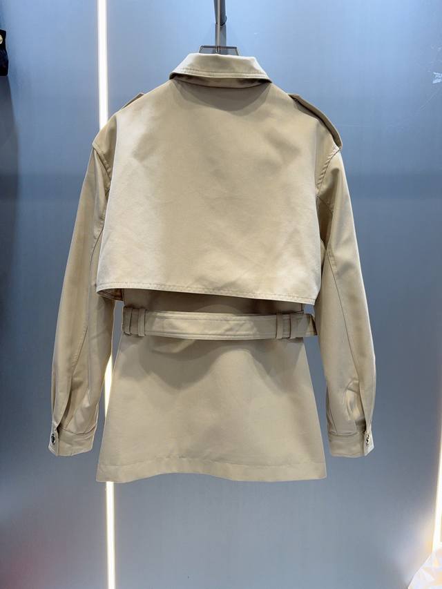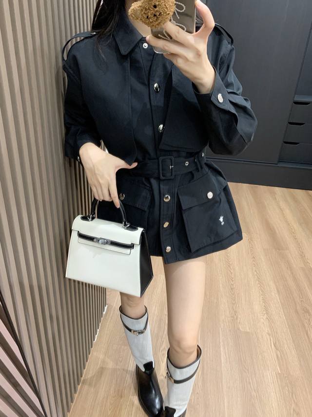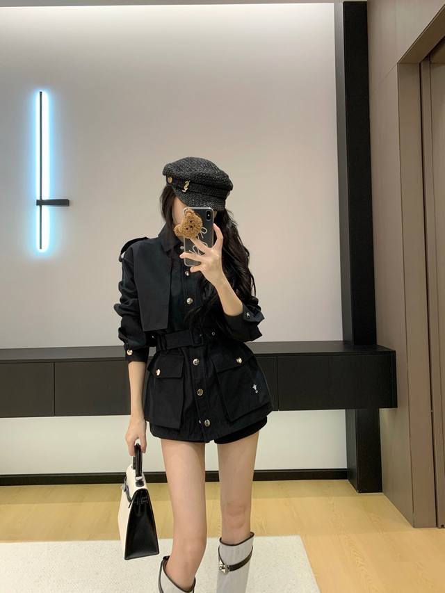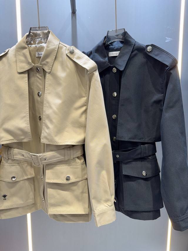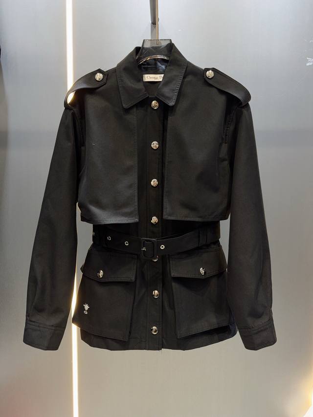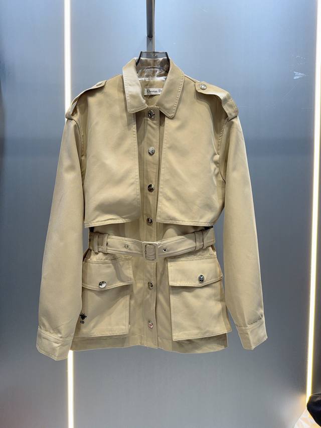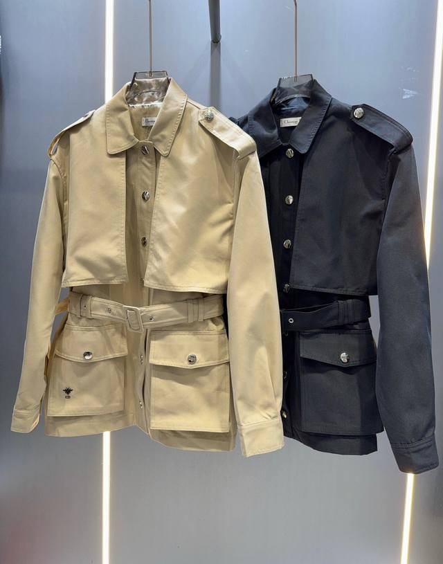 Dio* Dior Fw new mid-length trench coat with lapel and belt. Made from imported Yb material, this coat features a crisp, stylish, and premium feel. This mid-length trench coat features a lapel, a belted waist, and a symmetrical fold-over cape at the neckline. The front placket features printed snaps and flap pockets at the hem, adding a layered feel. The belted design frames the figure, while the pockets are embroidered with bees. When unfastened, they subtly showcase the brand's signature style and create an elegant silhouette. This seasonal trench coat combines fashion and practicality, evoking a charming, British-inspired look. Custom-made fabric and trims, this high-quality model is pictured wearing a stockist's coat in two colors. Color: Black Khaki. Sizes: Sml. Recommended S: 80-100. Recommended M: 100-115. Recommended L: 115-135.