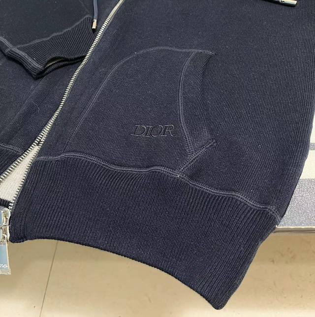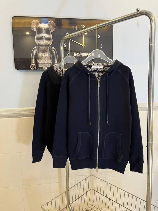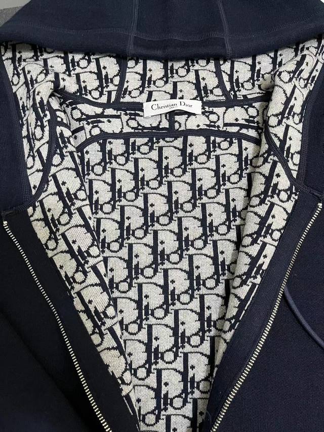 Style No. 250 Dior monogram logo cashmere knit long-sleeved hooded jacket. The entire garment features a jacquard lining, double-sided design with reverse letter jacquard weave, and imported cashmere yarn. One side is a solid color for a low-key and sophisticated look, while the other side is adorned with Dior's classic monogram print for a luxurious and high-end feel. Unisex style. Colors: Navy blue, White. Sizes: