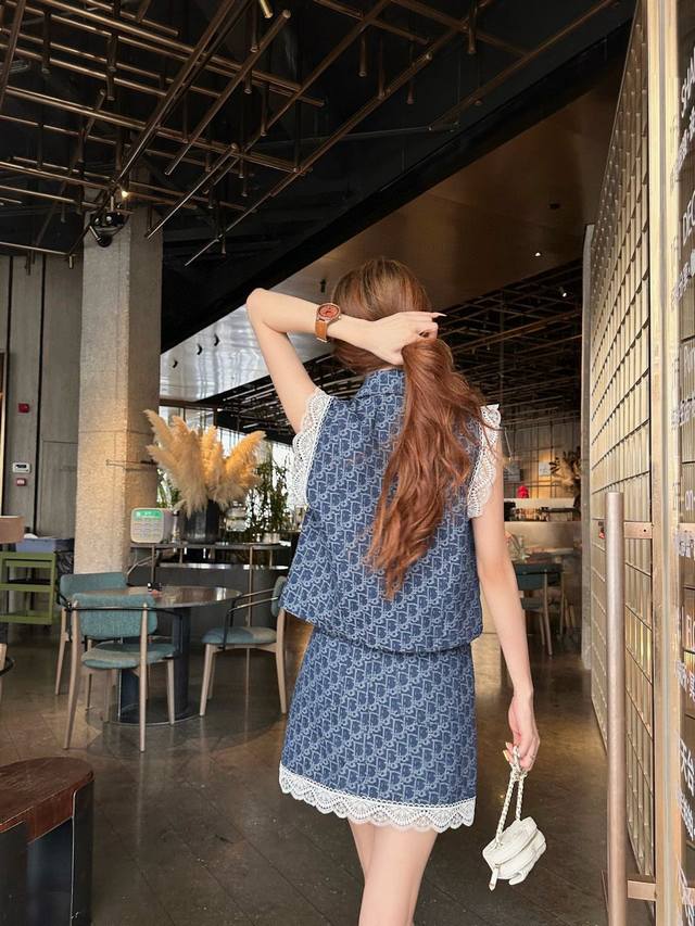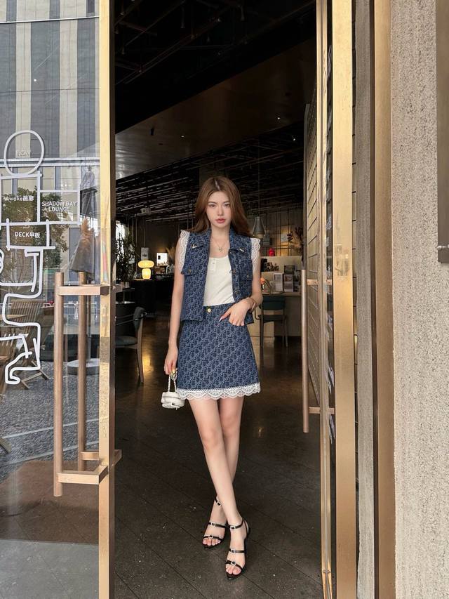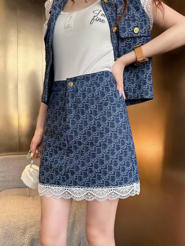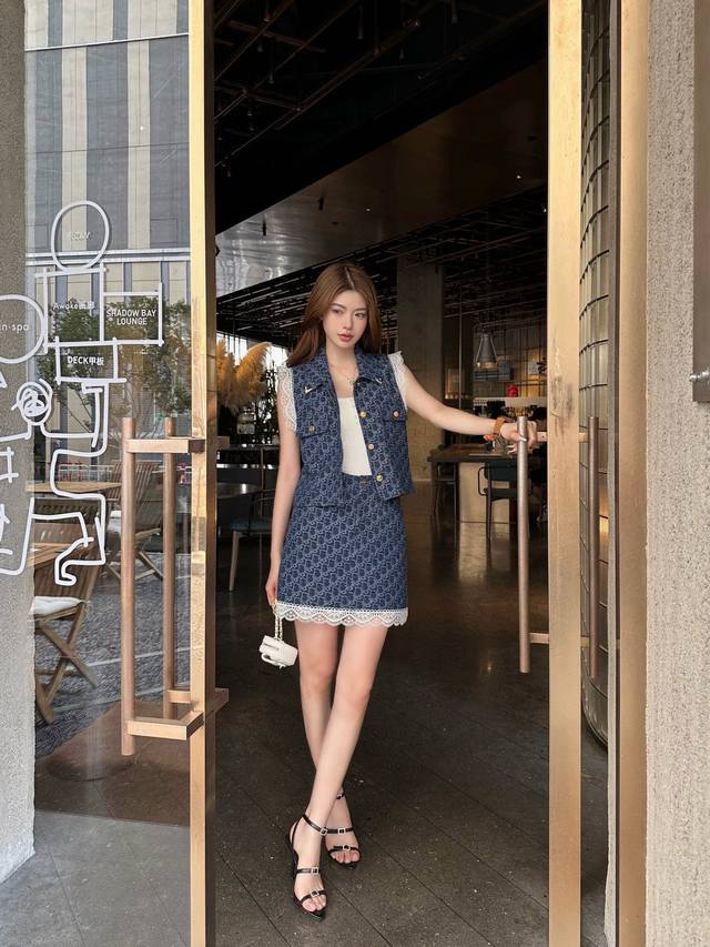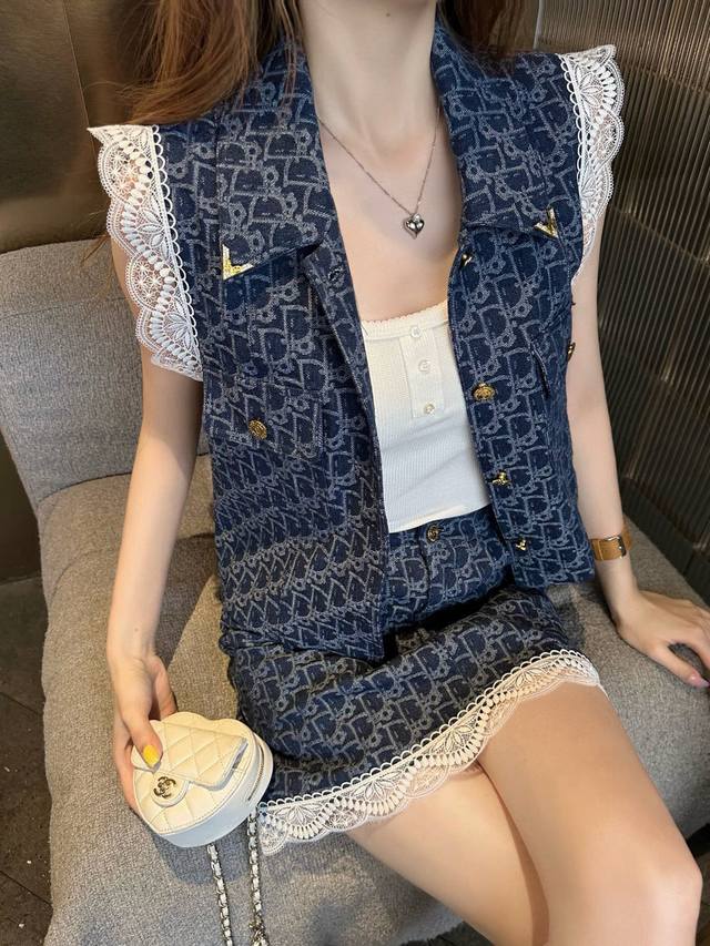 Dior Dior monogram jacquard lace stitching custom hardware button lapel sleeveless top short skirt denim suit