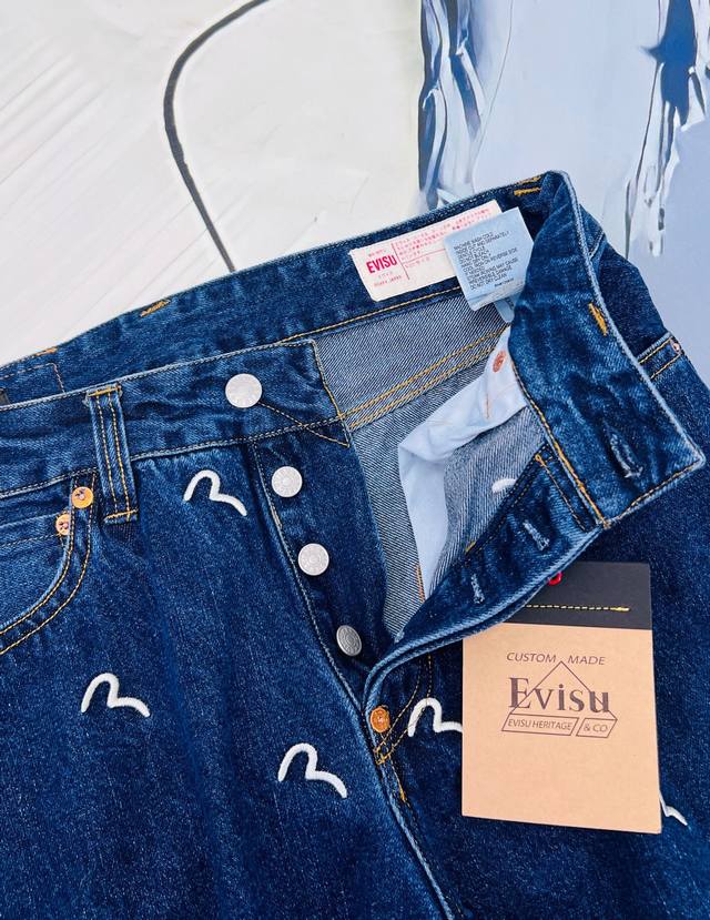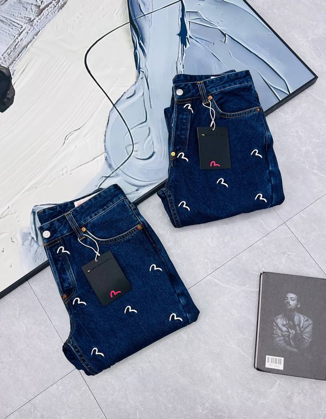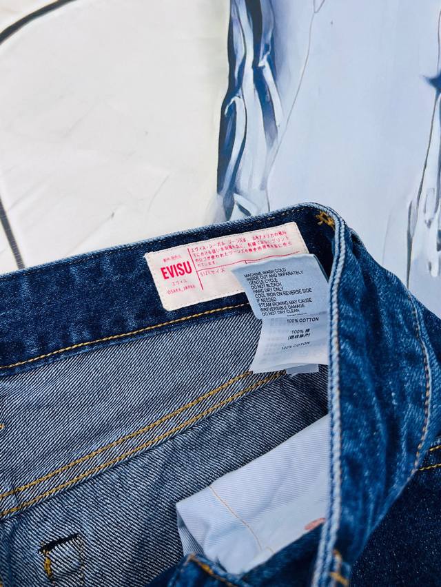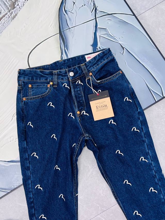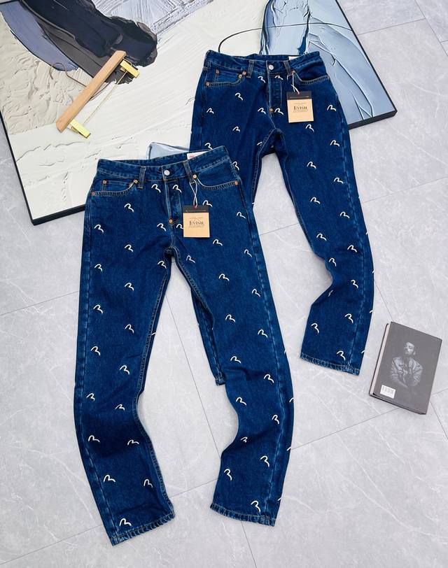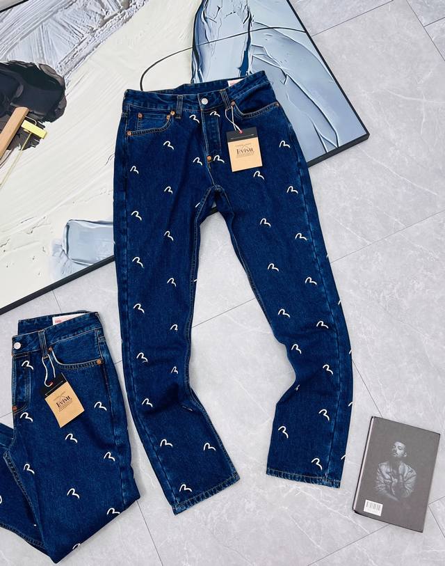 Heavily embroidered and in original colors, these Evisu all-over printed small-M jeans have a slim straight fit! Purchased from the official website, these authentic 1:1 denim fabrics are truly extraordinary. They're crafted using intricate, traditional weaving techniques and naturally dyed