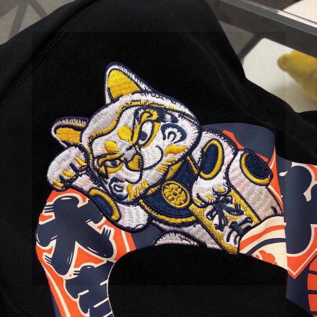 These sweatpants are printed with Evisu's combination pattern of origin in large M on the back, presenting a series of Japanese origin objects outlined by comic brushstrokes, and adding maneki neko embroidery to it for a playful touch.