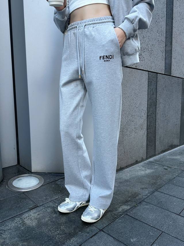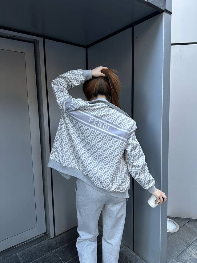 Fend* Double-sided lapel jacket and trousers set! Lapel zipper jacket with letter embroidery on the chest and double F jacquard print on the reverse. Paired with matching trousers with drawstring and elastic waistband. Available in gray and black. Sizes: Sml