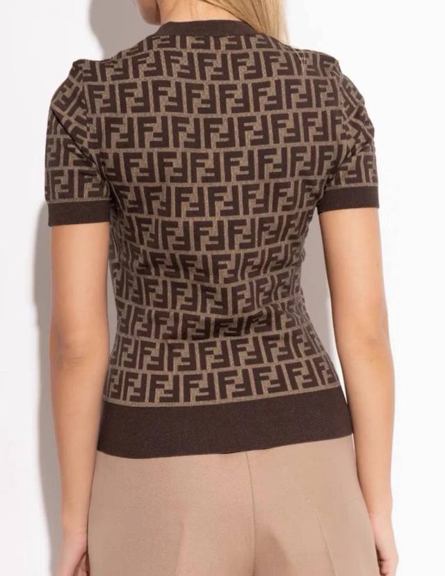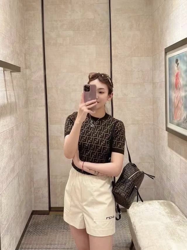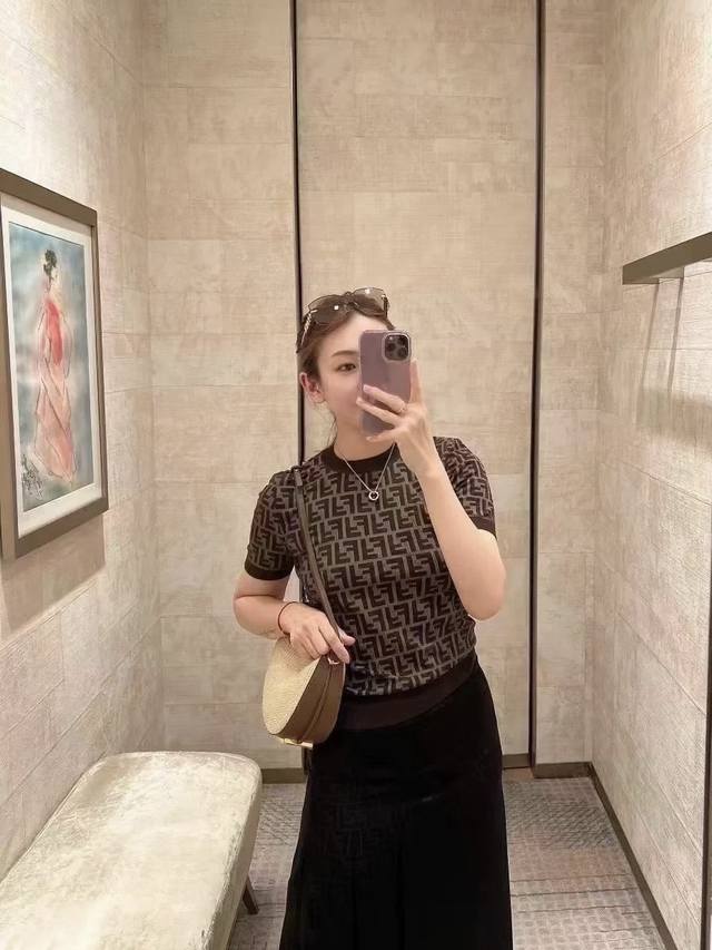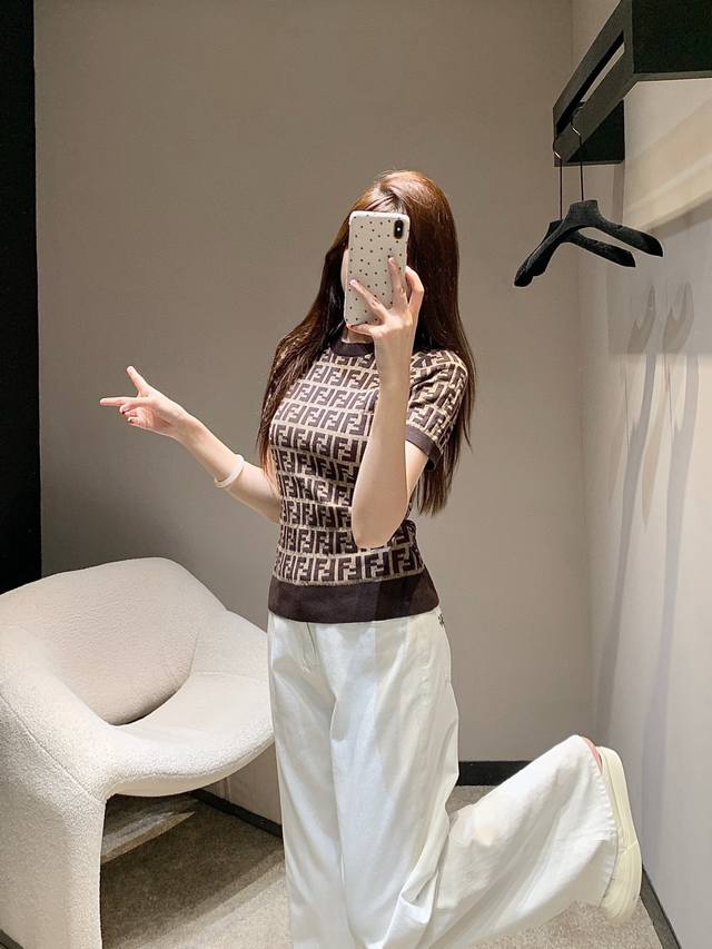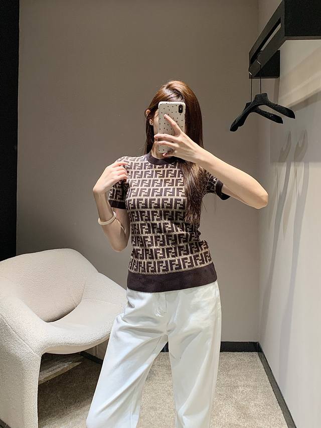 Fend* New High-End Custom Classic Double Ff Logo Jacquard Slim Fit Elastic Knit Short-Sleeve Top! Size M: Bust 86cm, Sleeve Length 23cm, Length 55cm (DDD)
