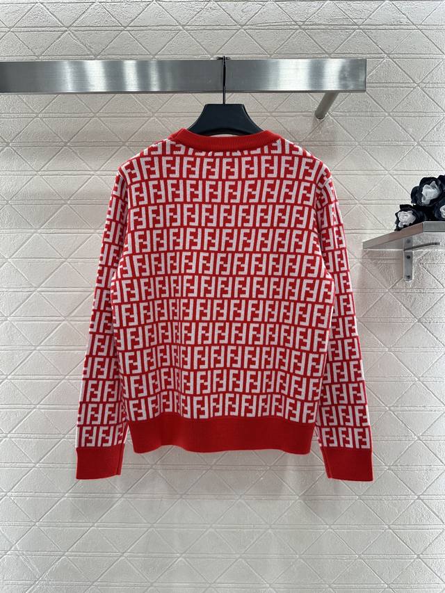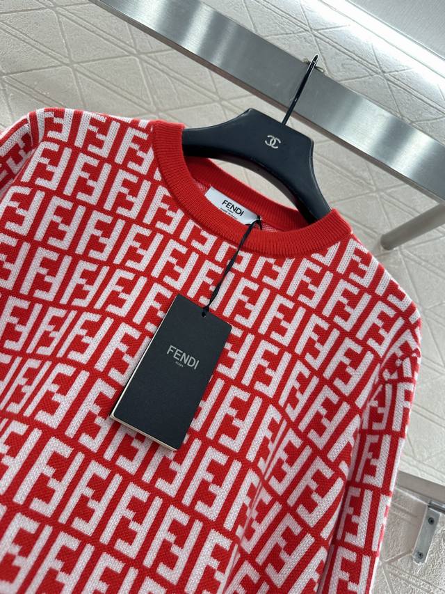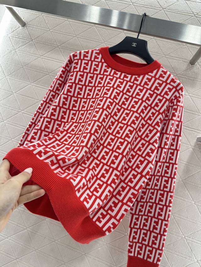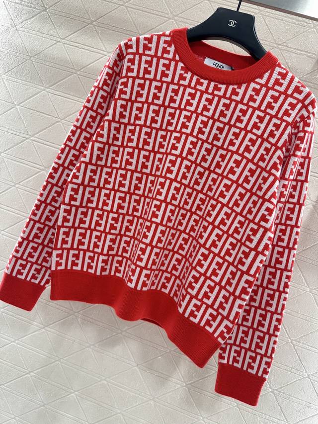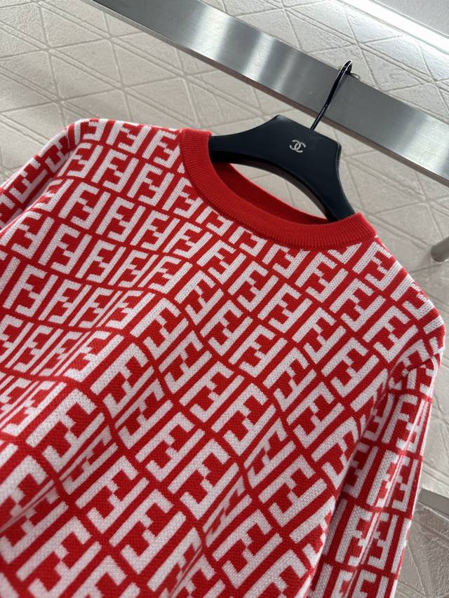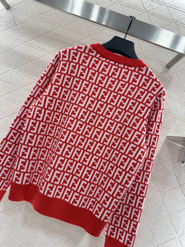 Fend*2026 New Arrival: Ddd Jacquard Crew Neck Pullover Sweater. Made of custom Yb wool knit material, this sweater boasts a high-quality feel, is incredibly soft and comfortable. The crew neck and long sleeves feature ribbed trim at the neckline and cuffs, echoing the hem. The entire sweater is covered in a double-F logo pattern, exuding a vintage feel and showcasing the brand's style. It has a regular fit, perfect for everyday autumn and winter wear. (Custom fabric and accessories, look for the high-quality red version.) DDD