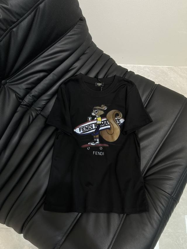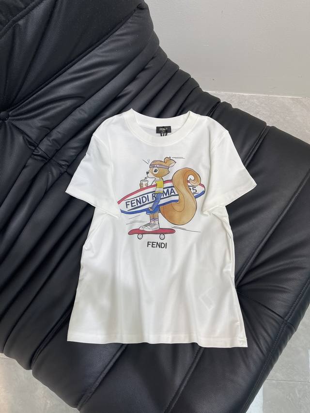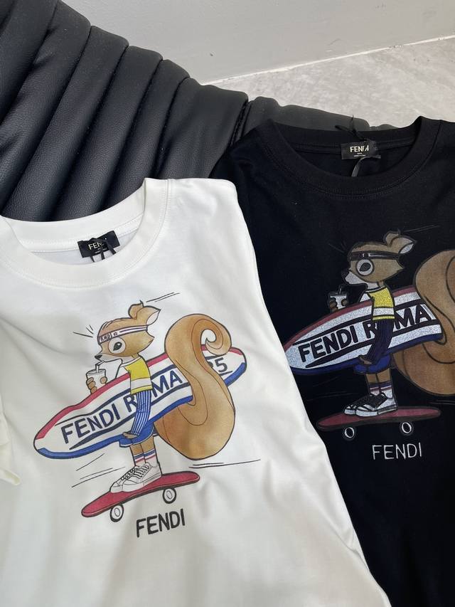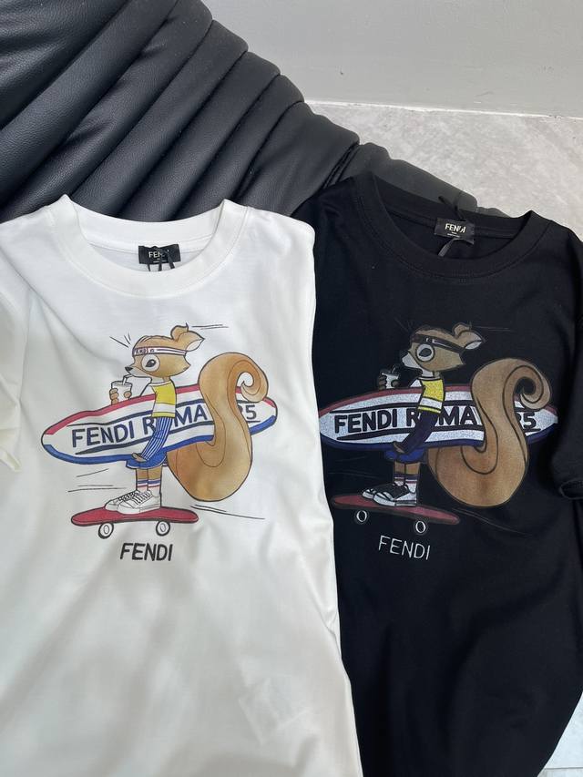 Fend*25 new cartoon squirrel on a skateboard short-sleeved T-shirt. Imported Tencel cotton fabric, classic version of the style is versatile and suitable for everyone, the upper body is very beautiful! Sml Aa