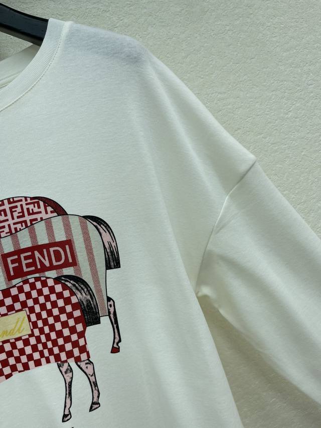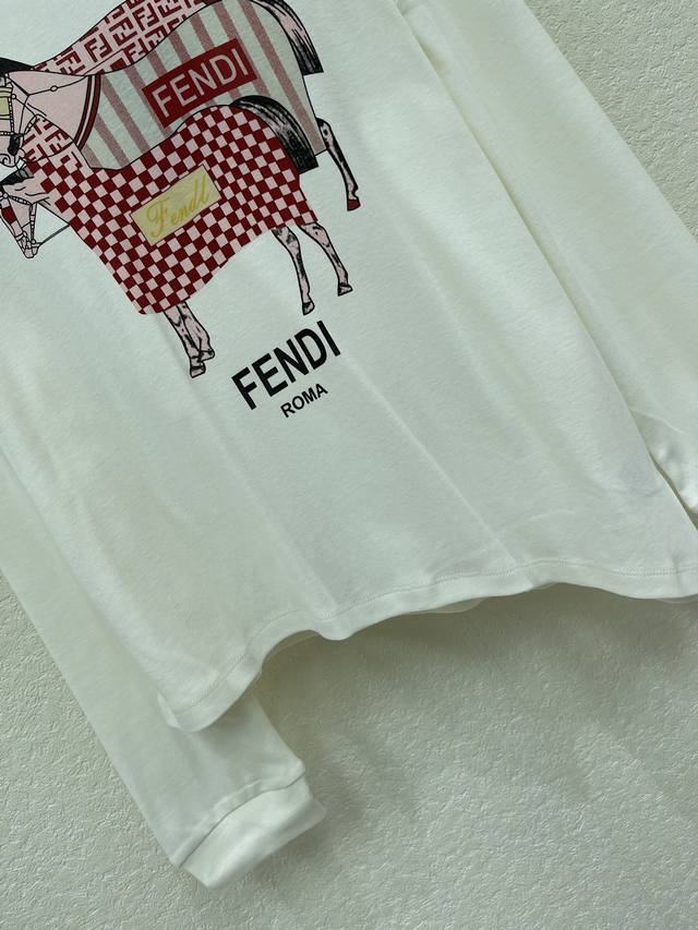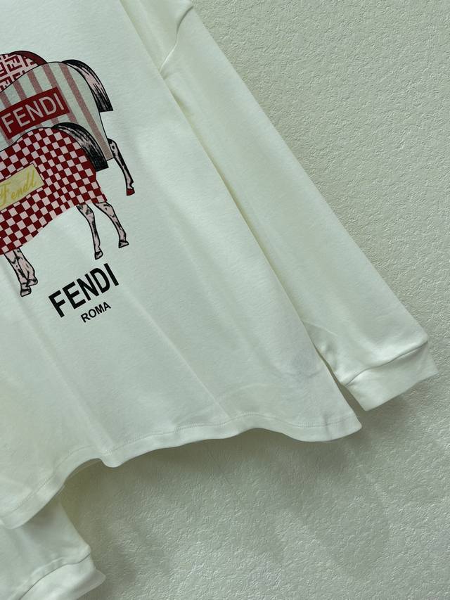 Fend*26 Early Spring New Printed Biscuit Long-Sleeve Top. Made of custom Yb twill cotton, breathable and stretchy, the irregular long-sleeve design and slanted hem break the monotony. The signature letter print and hand-drawn horse illustration on the chest, adorned with double Fs and geometric patterns, exude a high-end brand feel. Versatile and slimming, simple yet flattering for all body types, perfect for everyday wear, fresh and stylish. Sml Aa DDD