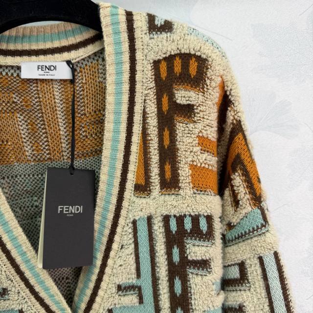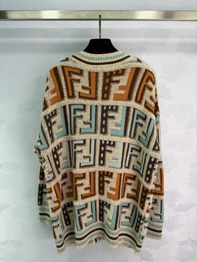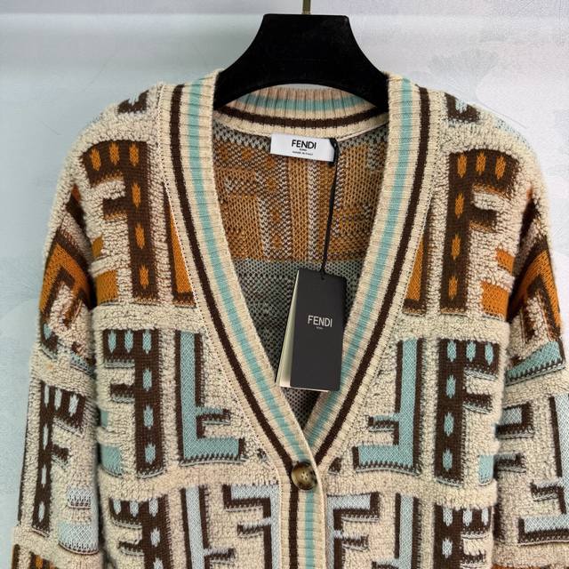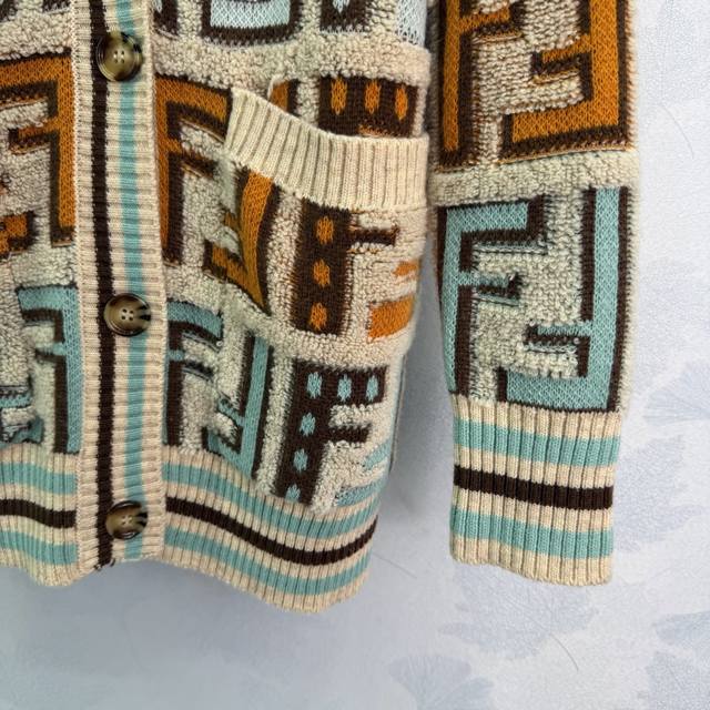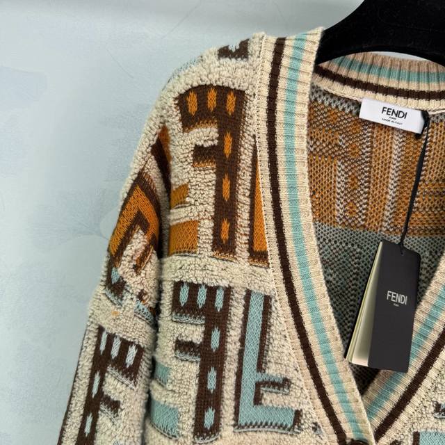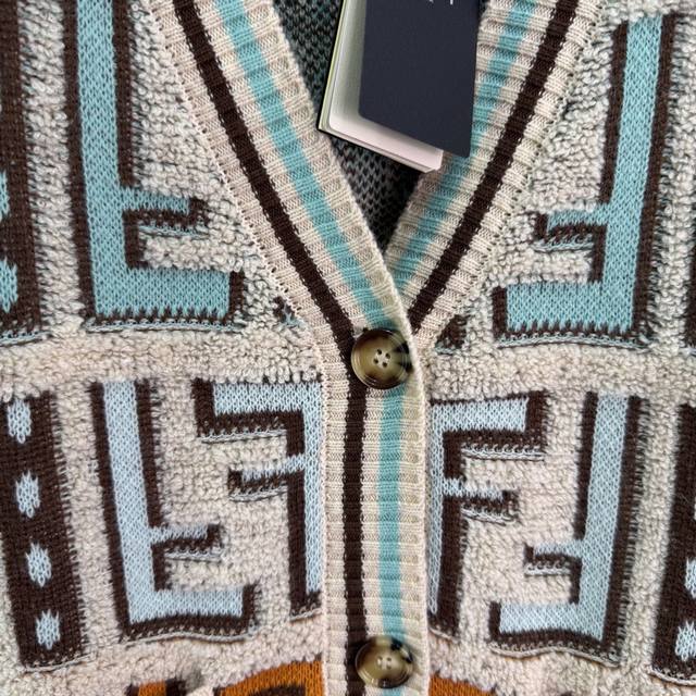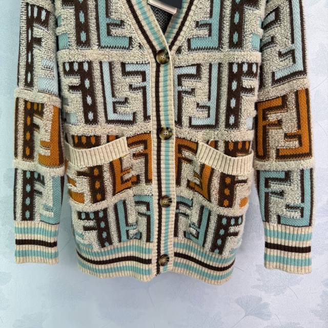 Fend*Ff jacquard V-neck cardigan wool sweater, made with high-quality wool, soft, skin-friendly, and warm. Available in blue, brown, and beige geometric jacquard with the highly recognizable Ff logo. The loose crew neck design, available in sizes S and L, suits all body types. Whether worn alone or as a base layer, it easily creates a stylish and casual look. A must-have for autumn and winter. Available in 1 color and 3 sizes S, M, L. T226B. DDD