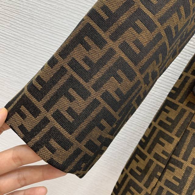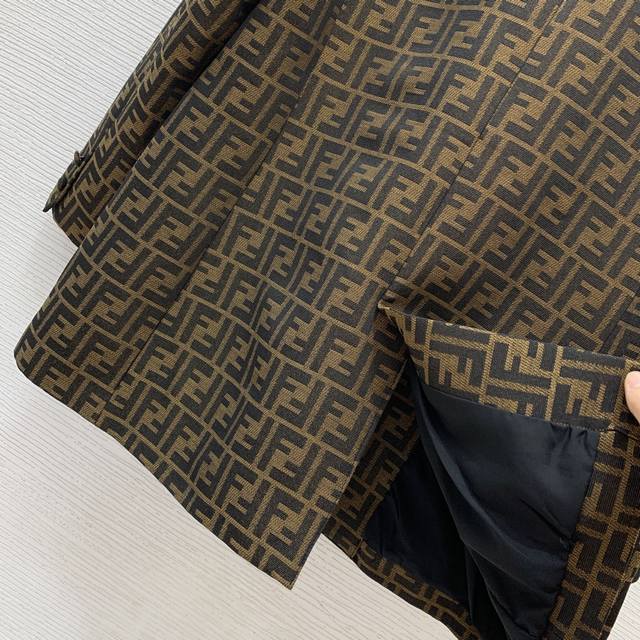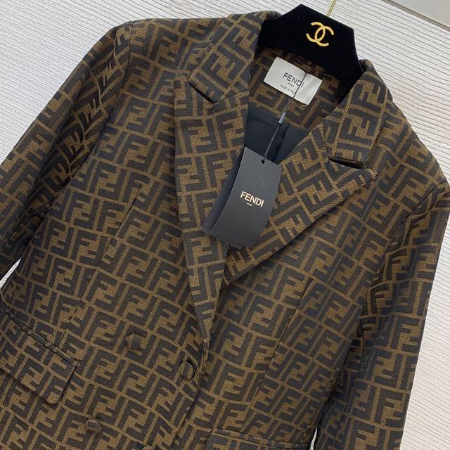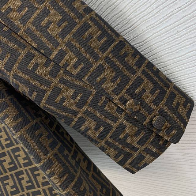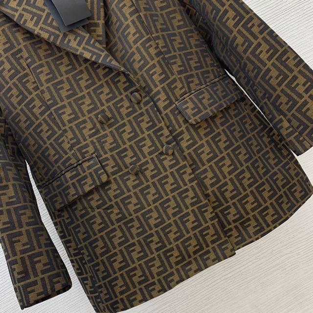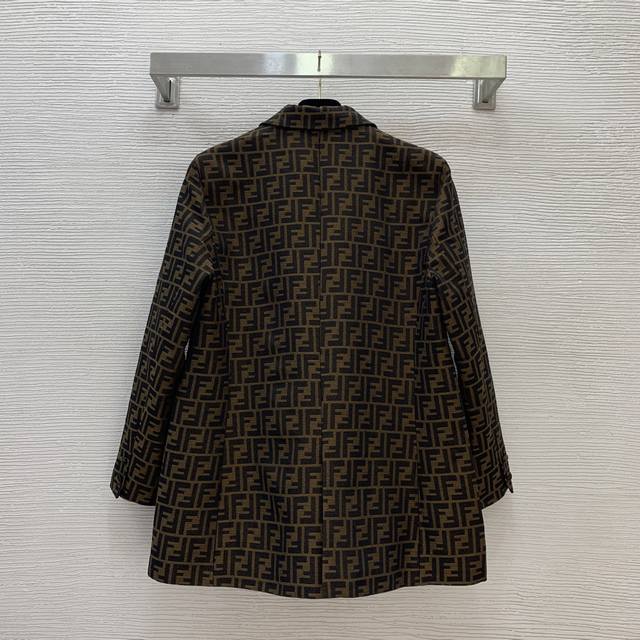 Fend's new custom double-Ff jacquard fabric has a crisp and stylish design! This double-breasted, four-button, loose-fitting, fashionable blazer features flap pockets! Size M: Shoulders 41" (padded), Chest 102", Sleeves 57", Length 72" (