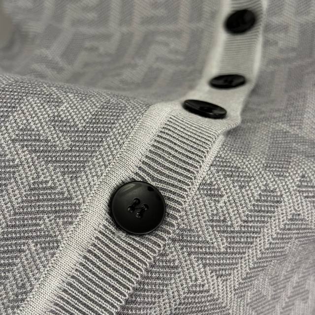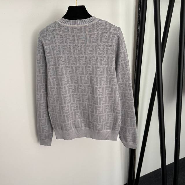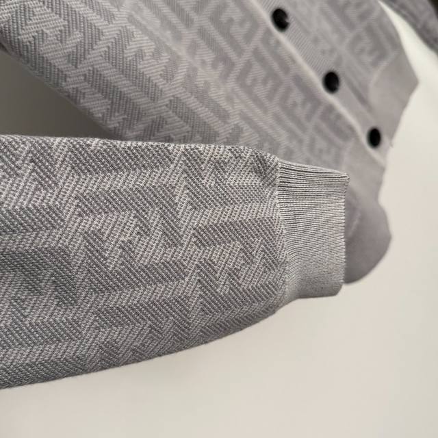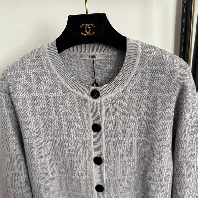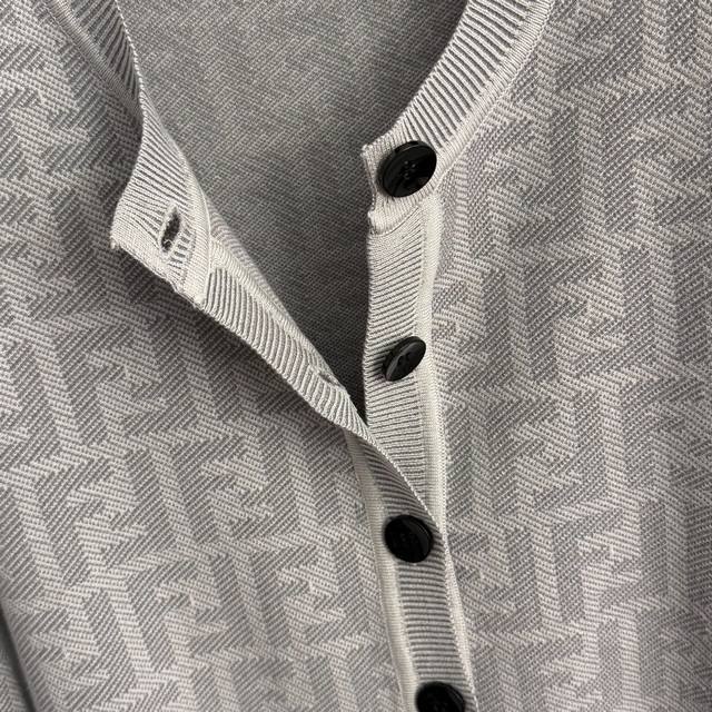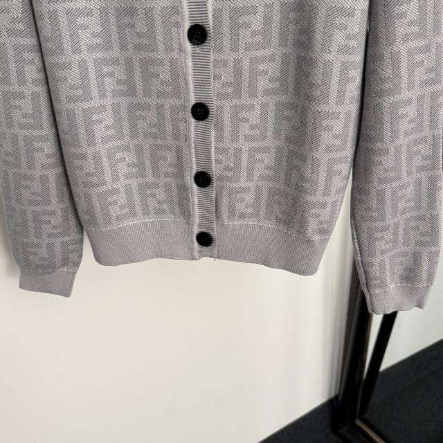 Style No. 20256872 Fend* New Monogram F Letter Crew Neck Long Sleeve Knit Cardigan, Light Gray, Dark Gray, Sizes 36, 38, 40. Size 40: Shoulder width 36cm, Bust 92cm, Sleeve length 60cm, Length 58cm; Weight: 0.420Kg. (