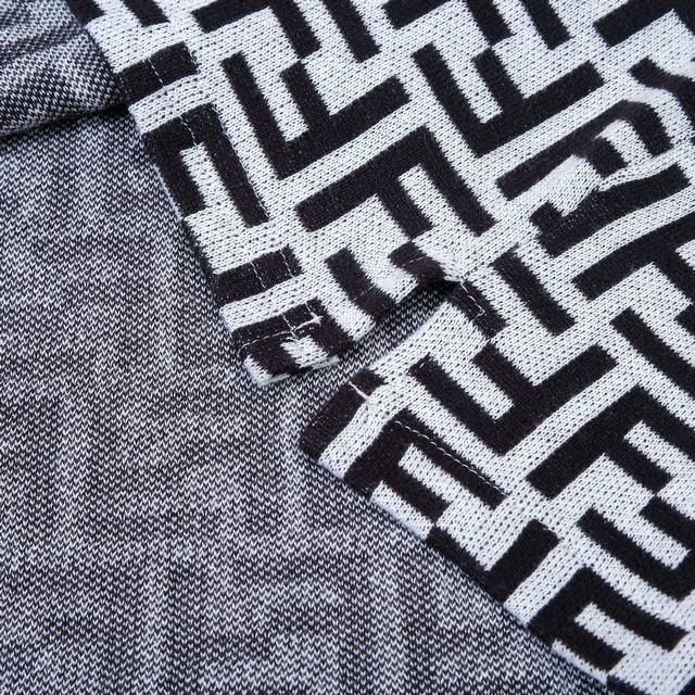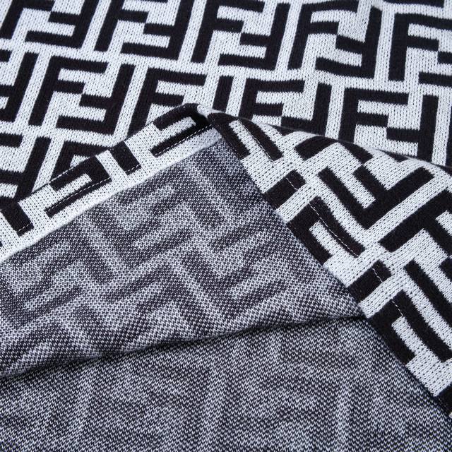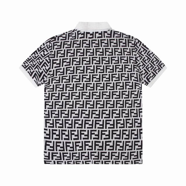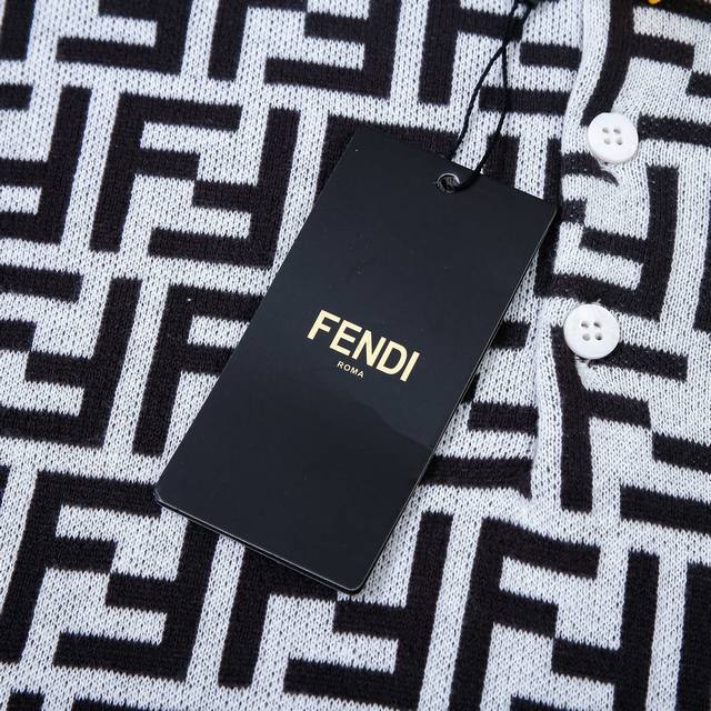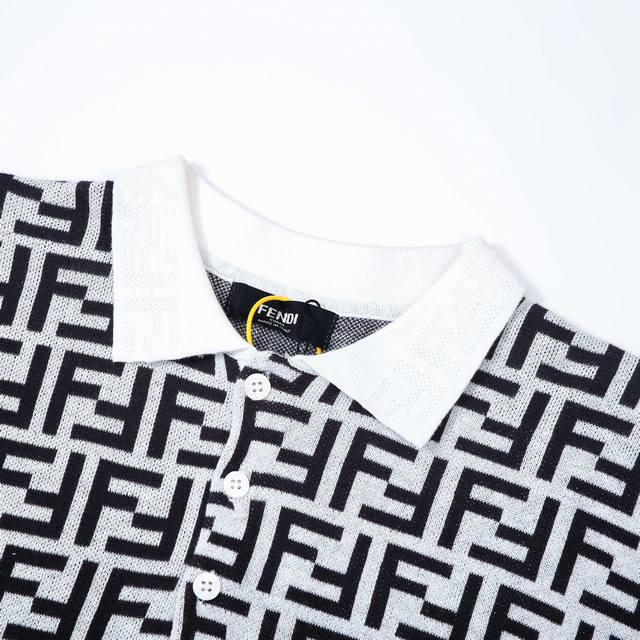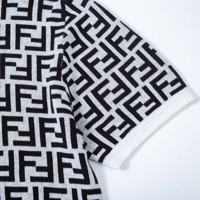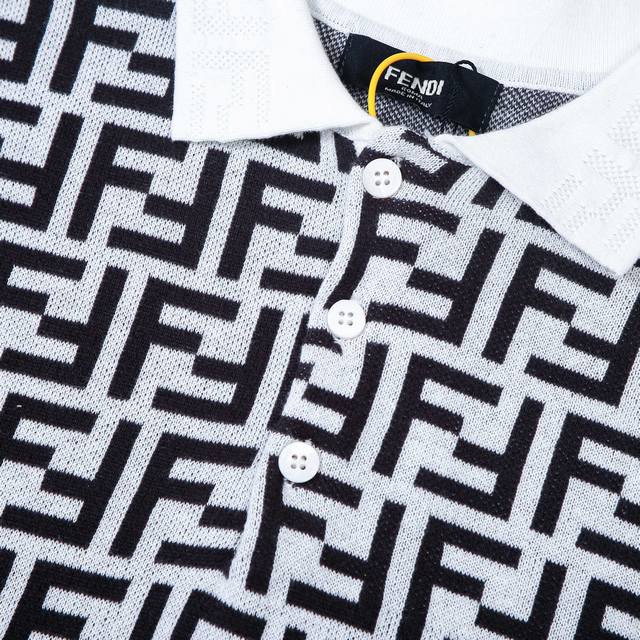 A jacquard-knitted wool polo shirt with the classic Fendi logo printed all over the front and back. This knitted short-sleeved shirt is exquisitely crafted, with a silky, breathable fabric that feels premium and soft to the skin. The fine-knit stretch fabric is lightweight and breathable without any sense of restraint. The classic style is completed with a jacquard-knitted design featuring contrasting front and back stripes. The jacquard-knitted fabric is comfortable and feels great. Unisex style. Model: F225. Color: Black and White. Sizes: S, M, L, XL.