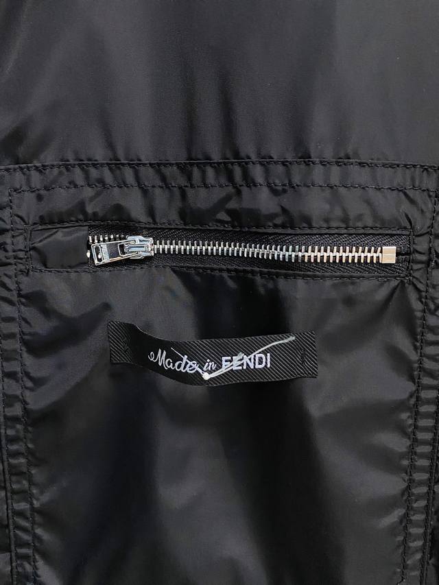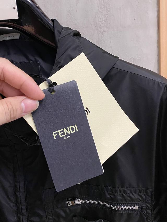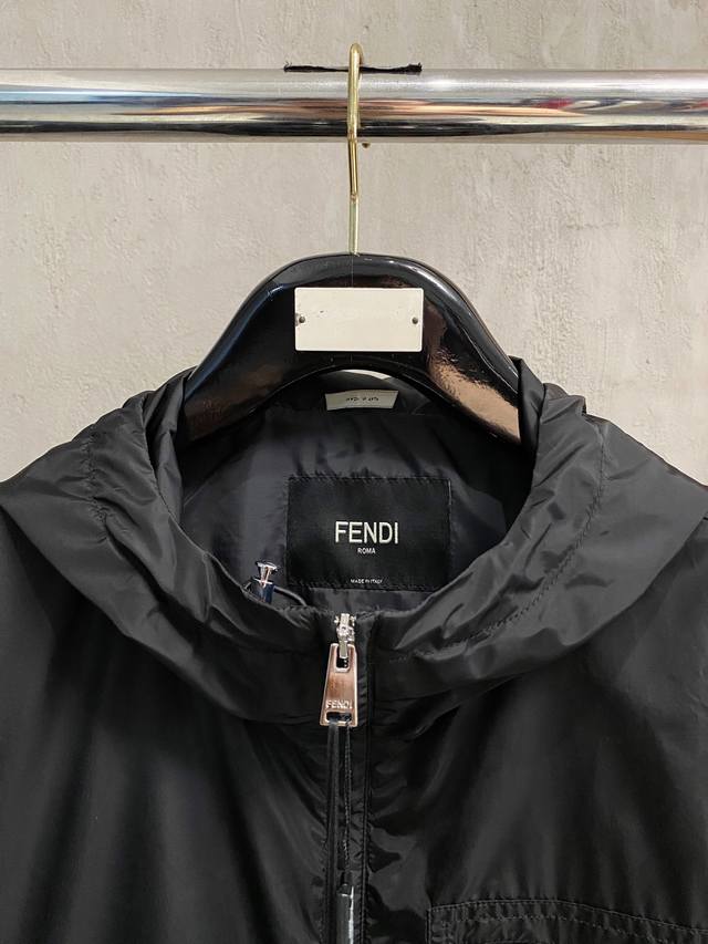 A windbreaker with a hood and side zipper pockets. Elasticated cuffs and a drawstring hem. Double-ended zipper closure. Made of blue nylon. A matching "Made in Fend Fd" label adorns the chest zipper pocket.