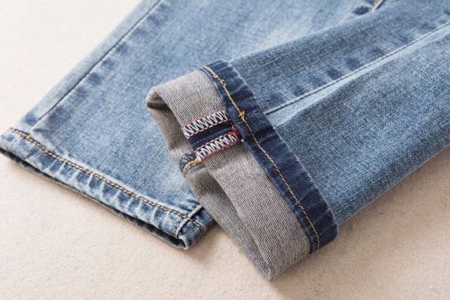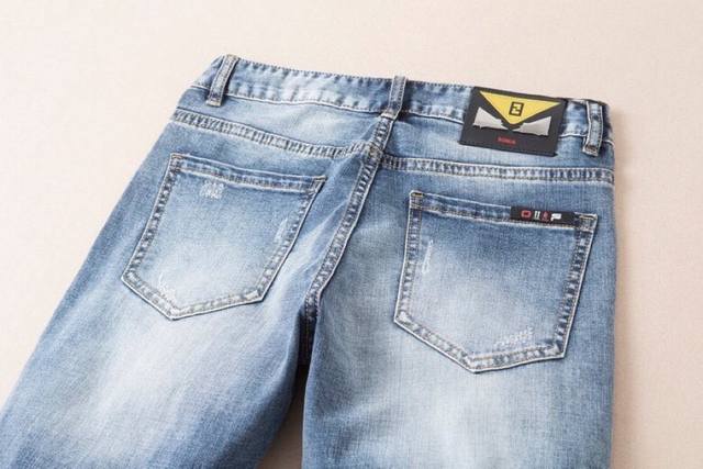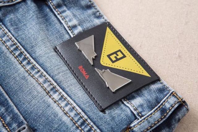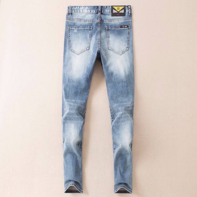 Fendi men's new spring/summer jeans. This high-end ready-to-wear collection features a striking design. Made from a custom denim fabric imported from Italy, it offers a sleek, drapey fit. The fabric is highly stretchable, smooth, and comfortable, with an exceptional drape. The exquisite leather logo patch on the back pocket adds a luxurious touch. Crafted with premium materials, the jeans are incredibly textured, and meticulous attention to detail further enhances their quality. Sizes: 28-36