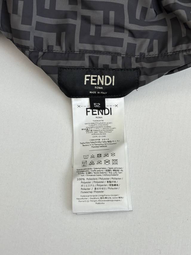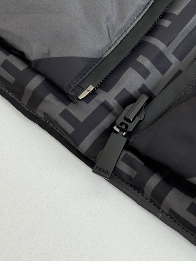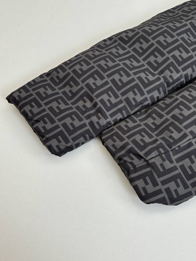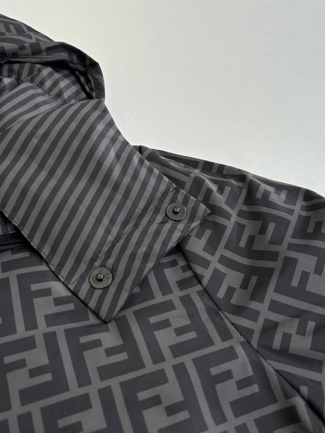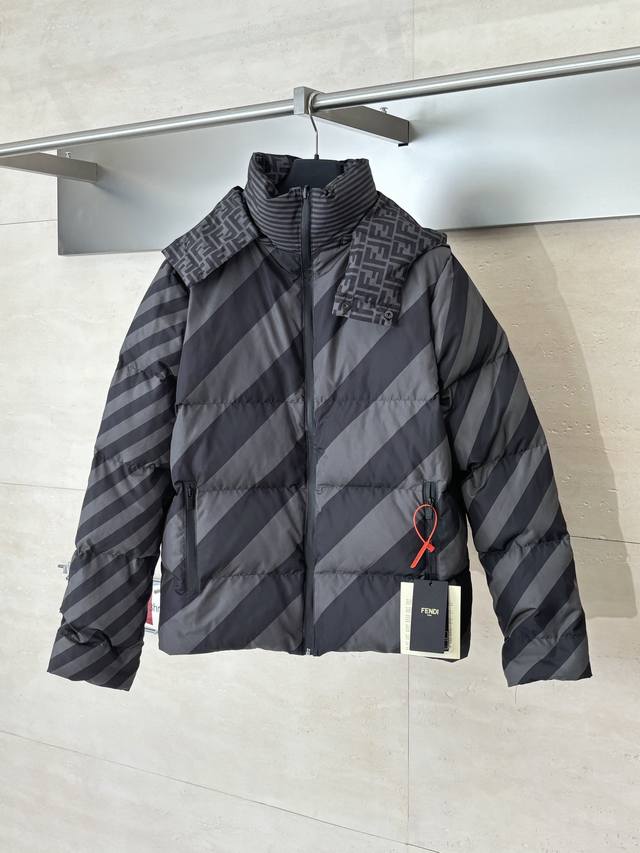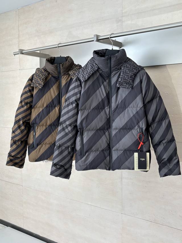 Fend* Fendi all-over striped reversible hooded down jacket DDD Custom high-density calendered nylon, using new national standard 90% white duck down. Welcome to test. Fully filled down. Computerized mechanical filling is preferred. The filling area is determined by making an inner lining pattern. The weight of down per square meter is determined according to the original three-dimensional effect, thus calculating the filling amount of each piece. The computerized filling machine uses a digital weighing unit to achieve stable measurement. Digital direct-to-garment printing technology is used. The machine analyzes the original layout and converts the pattern information into digital signals, directly spraying the dye onto the fabric surface to achieve a high-resolution printing effect with clear details and natural colors. DDD Size: 48 50 52 54 DDD