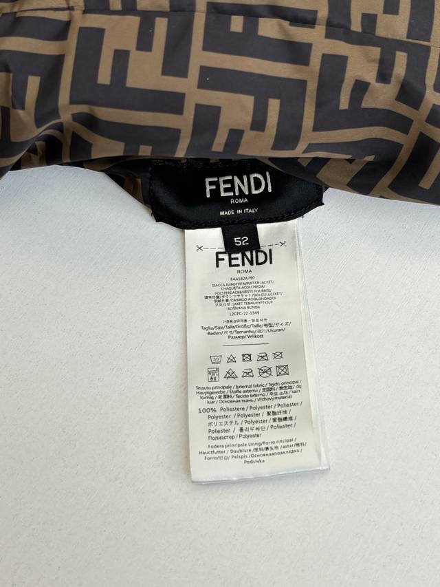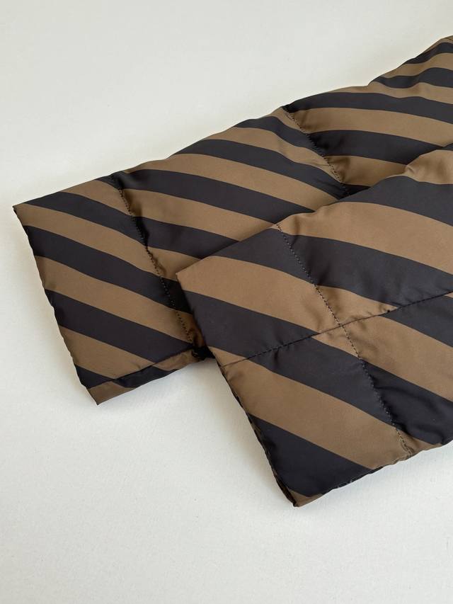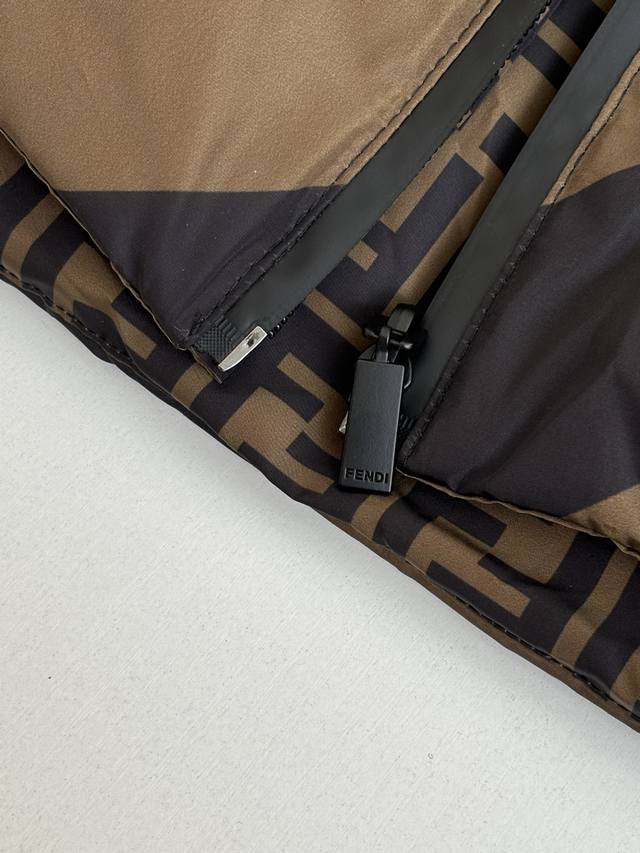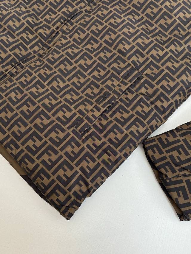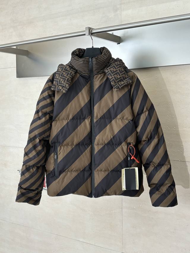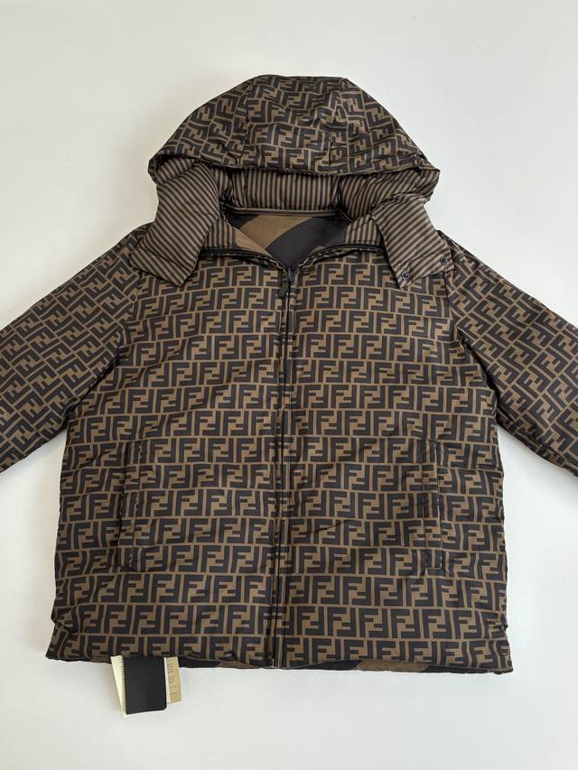 Fend* Fendi all-over striped reversible hooded down jacket DDD Custom high-density calendered nylon, using new national standard 90% white duck down. Welcome to test. Fully filled down. Computerized mechanical filling is preferred. The filling area is determined by making an inner lining pattern. The weight of down per square meter is determined according to the original three-dimensional effect, thus calculating the filling amount of each piece. The computerized filling machine uses a digital weighing unit to achieve stable measurement. Digital direct-to-garment printing technology is used. The machine analyzes the original layout and converts the pattern information into digital signals, directly spraying the dye onto the fabric surface to achieve a high-resolution printing effect with clear details and natural colors. DDD Size: 50 52 54 56 DDD