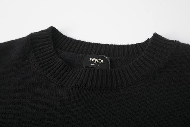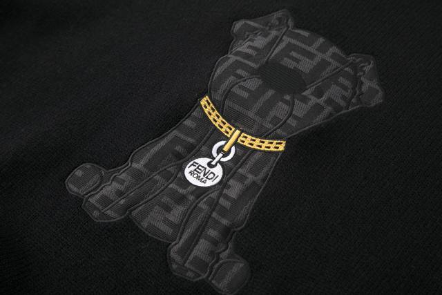 Fendi 25Fw New Puppy Applique Embroidered Logo Sweater. Made of a 50% wool, 40% cotton, and 10% polyester blend. The puppy applique on the chest is made of mercerized Oxford cotton gauze, with embroidered edges and stitched details. Features a custom black Ff jacquard patch in black wool yarn. Sizes: S, M, XL. In stock, ships immediately.