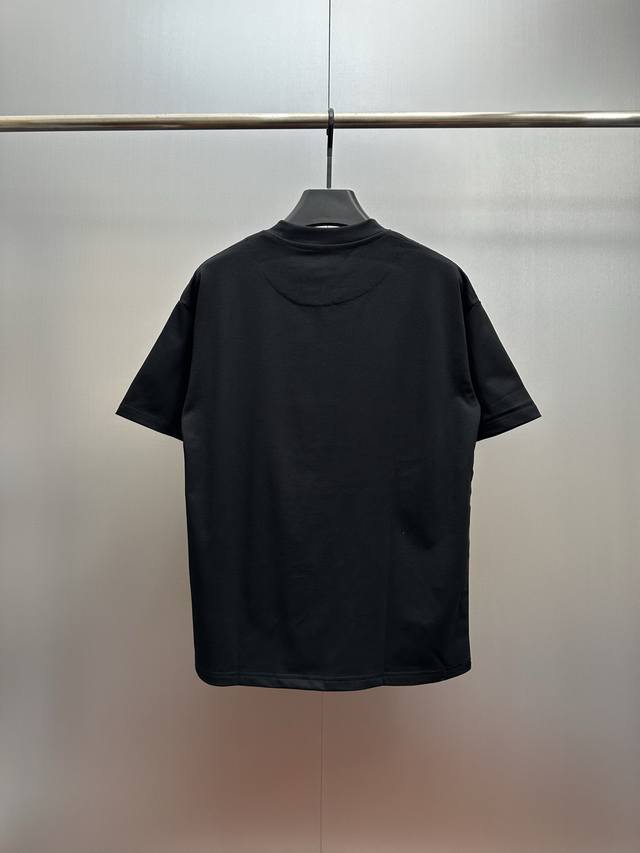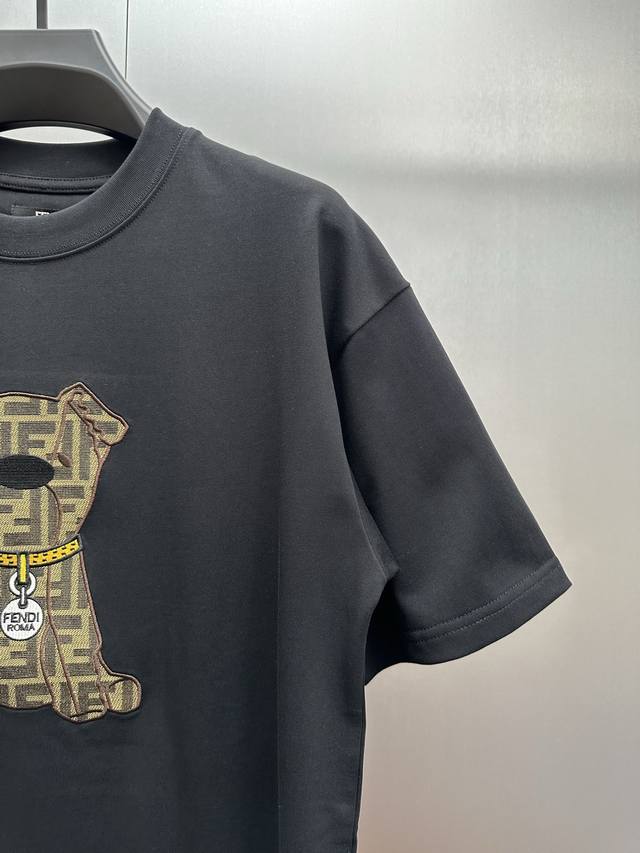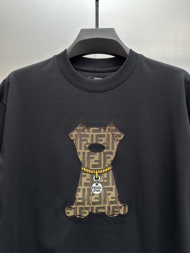 Fendi Cute Dog Embroidered Short-Sleeve T-Shirt (DDD) Made of 320g heavyweight cotton, this Fendi black T-shirt is incredibly stylish! The front features a classic double-F monogram pattern paired with a cute dog embroidery, complemented by a gold collar. It's adorable yet sophisticated, showcasing meticulous craftsmanship in every detail. Made from premium high-weight pure cotton, it's thick, breathable, and wrinkle-resistant. Sizes: S, M, L, XL