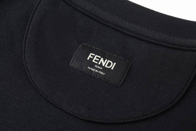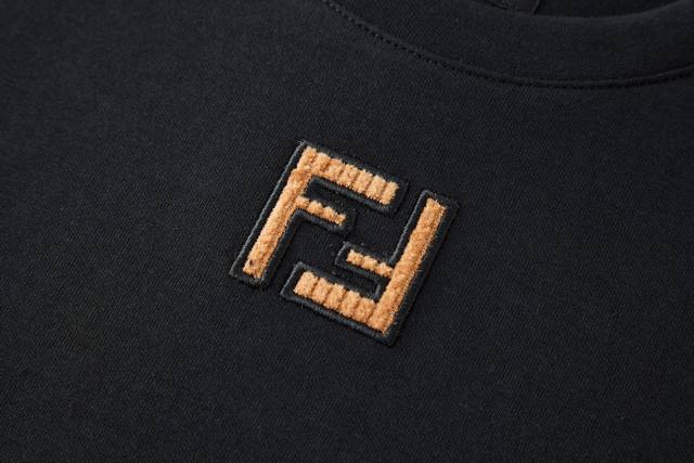 Fendi Double F Suede Embroidered Logo Short-Sleeve T-Shirt Fabric: 260g mercerized double-sided fabric. Craftsmanship: 3D embroidery, with corduroy suede filling and embroidered edges. Standard fit short-sleeve crew neck T-shirt. Black pure cotton. Features a brown corduroy miniature Ff pattern on the front. Accessories: Custom 1:1 wash label. Craftsmanship: Custom 1:1 embroidered logo. Sizes: S, M, L, XL. Color: Black. Style Number: 86415