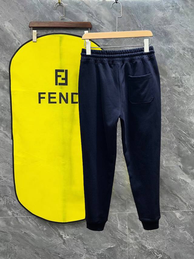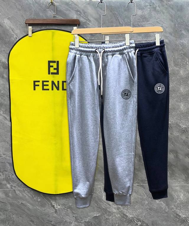 Fendi Fall/Winter Runway Slim Fit, Exquisite Print, Simple Logo Sweatpants. Made in China by a domestic OEM/export supplier. Top-tier brand fabric, 360g weight, suitable for all body types. Features include an elastic waistband, black and white drawstring design, custom drawstring pockets, slanted side pockets, and a small back pocket. Colors: Black, Gray. Sizes: S-XL.
