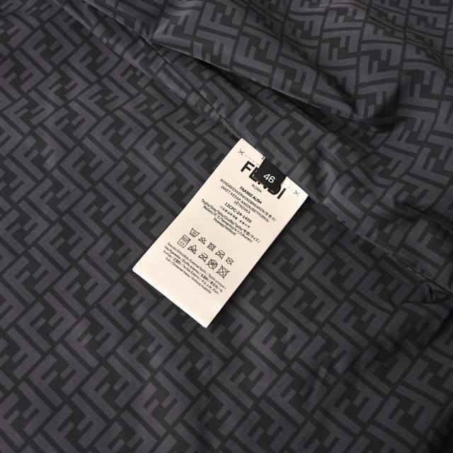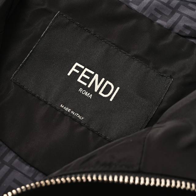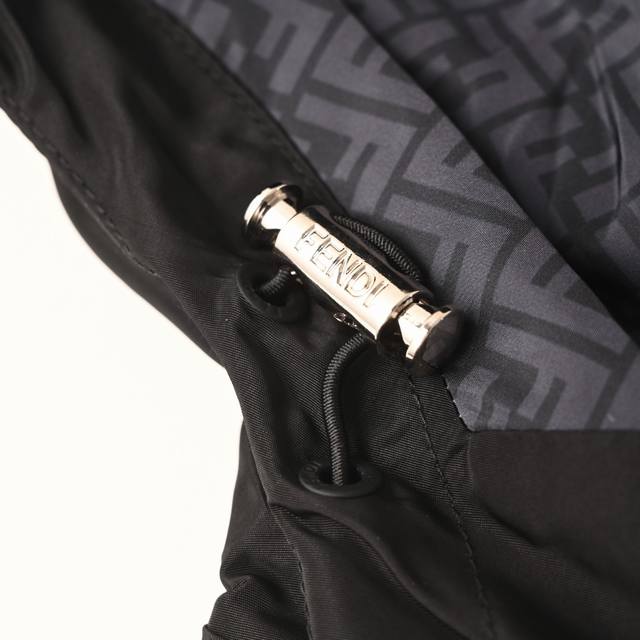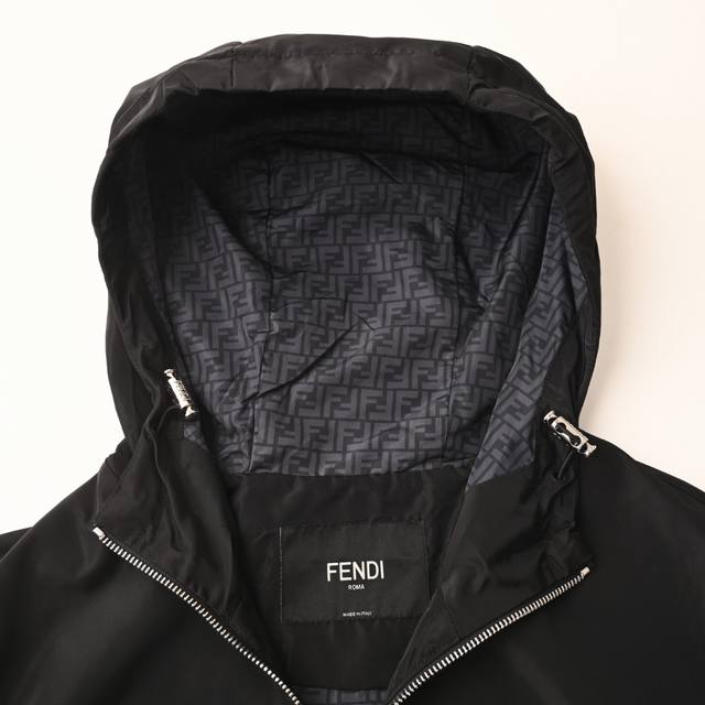 Fendi Fd Hardware Technology Fabric Hooded Jacket Ddd This high-tech fabric is made from 100% polyester fiber, modified to reduce the polyester monofilament fineness to 0.1 denier. The high-density weave creates a tight plain weave, reducing gaps and providing a smooth feel while maintaining crispness and durability. Digital direct-to-garment printing is used; the machine analyzes the original lining layout, converting the pattern information into digital signals, and directly spraying high-quality, durable ink onto the fabric surface to achieve a high-resolution printing effect with clear details and natural colors. A custom small metal Ff logo adorns the chest for enhanced brand recognition. The hood lining also uses fabric with the Ff logo, adding to the brand's brand identity. Custom accessories Ddd Size: 46 48 50 52 DDD