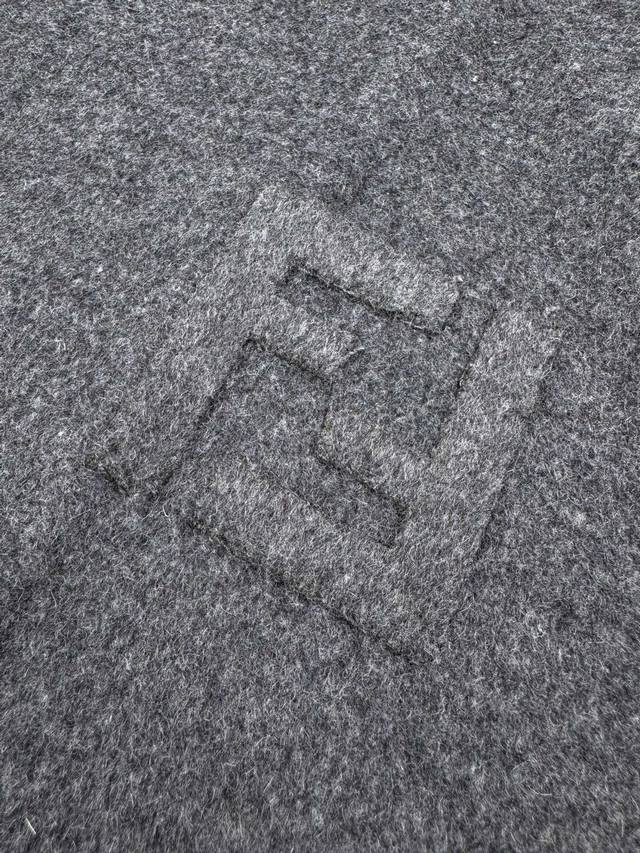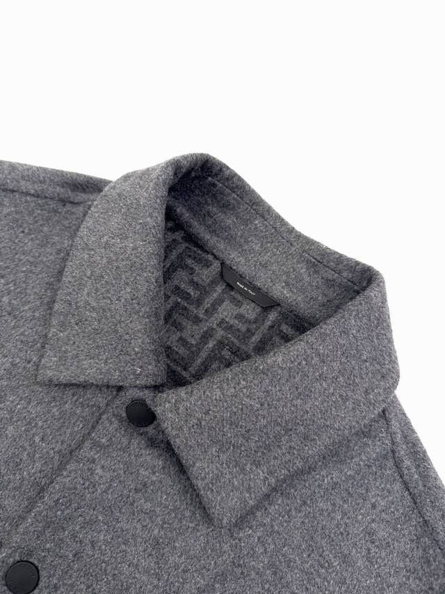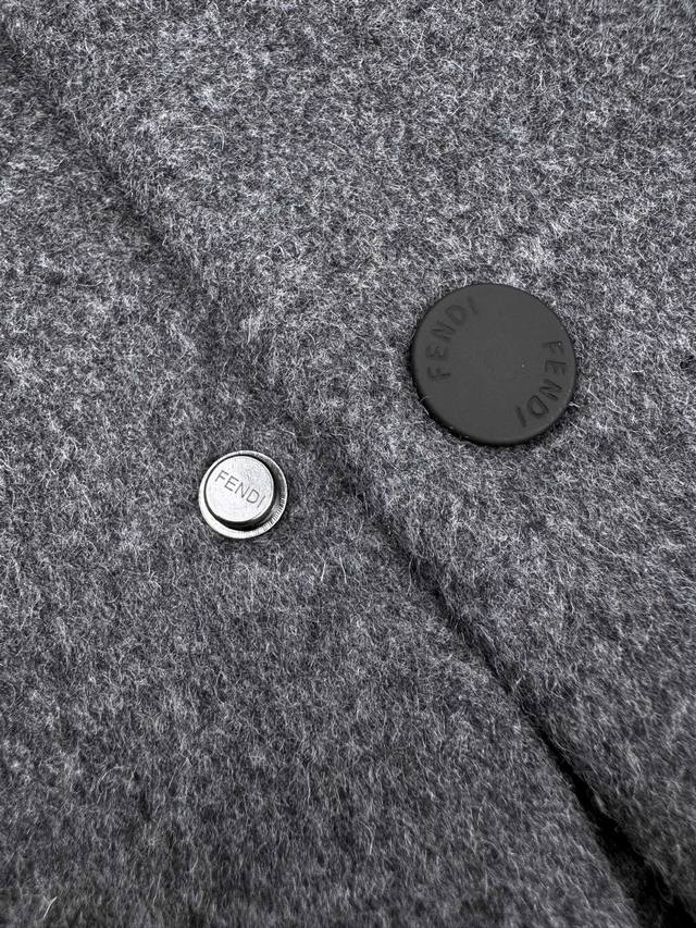 Fendi Ff Embossed Wool Jacket Ddd Custom-made luxurious double-woven cashmere and silk fabric, warm, soft, comfortable, and skin-friendly. With a sophisticated smoky gray tone as its base, it possesses a beauty that blends vicissitude and elegance. The iconic Ff embossed lettering adorns the chest, perfectly interpreting the brand's DNA. The Ff pattern on the lining hides a unique surprise
