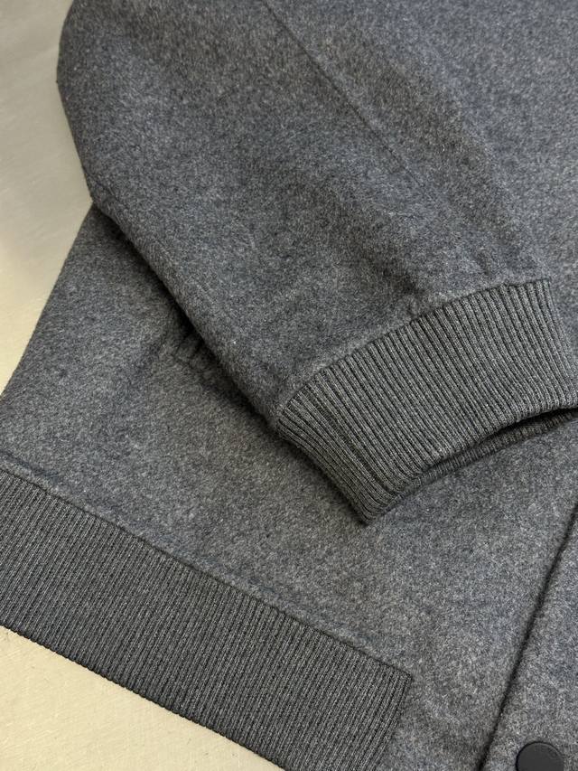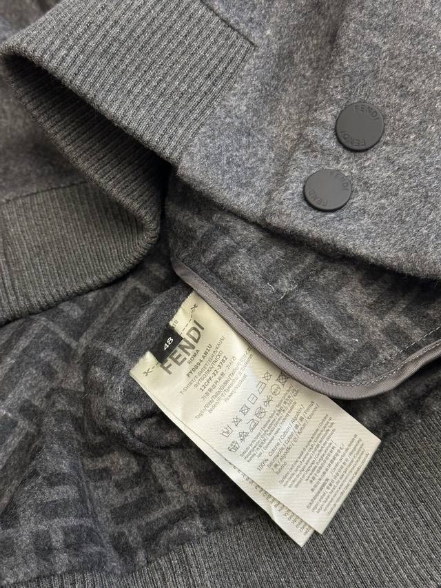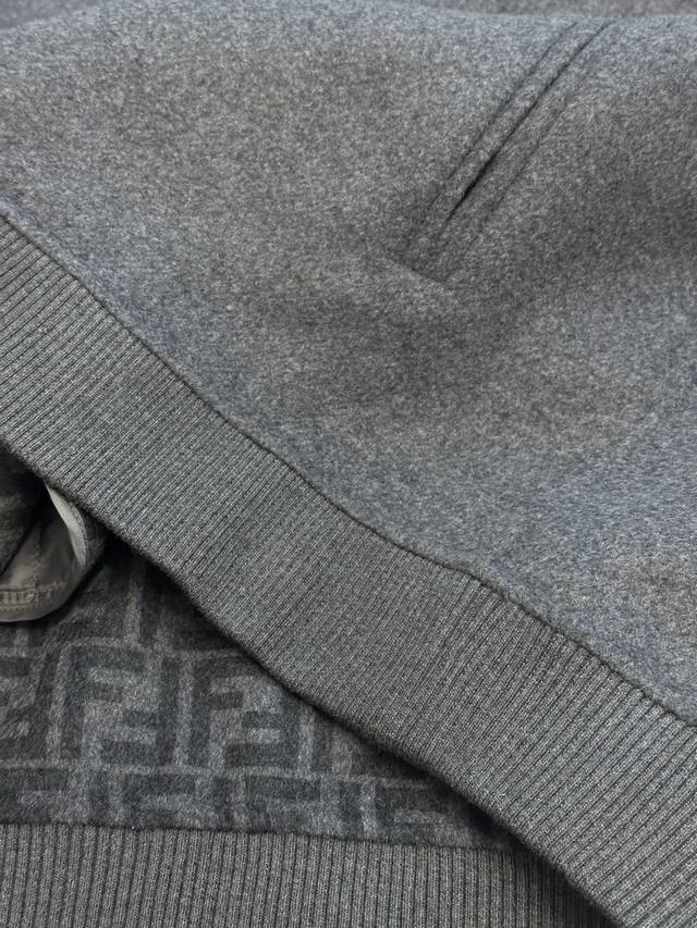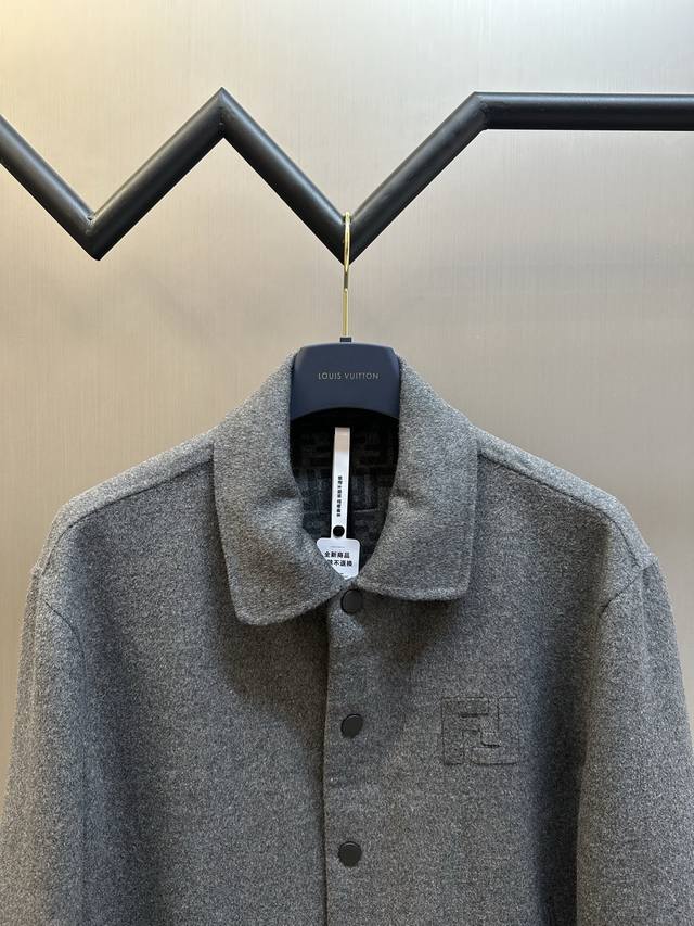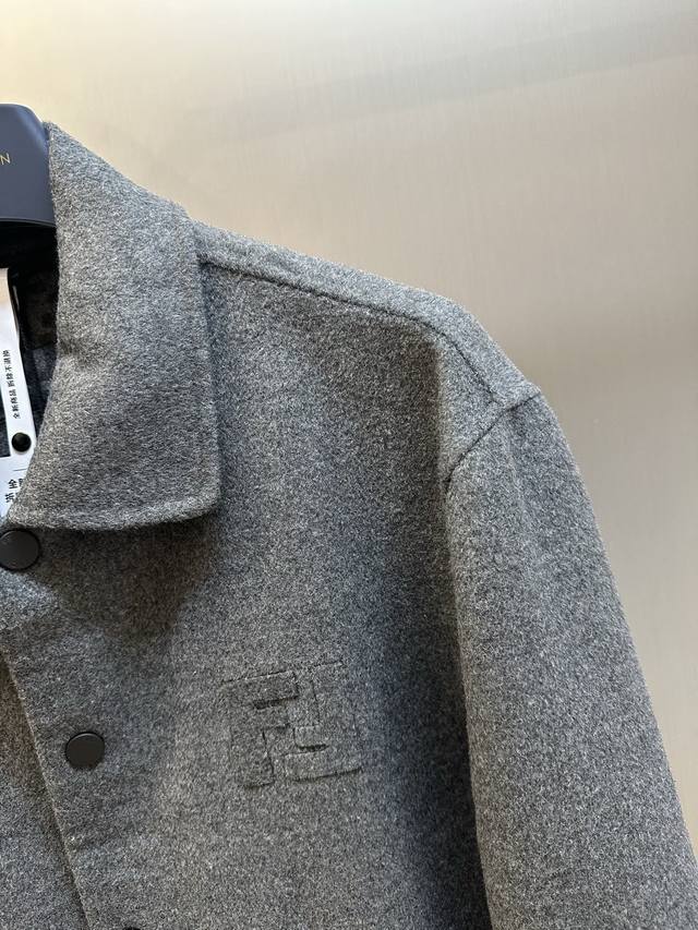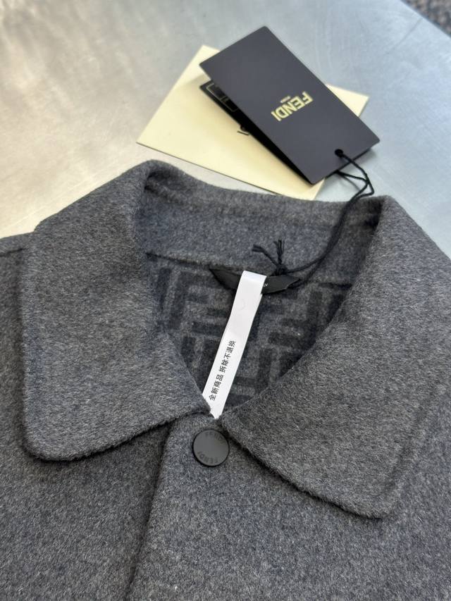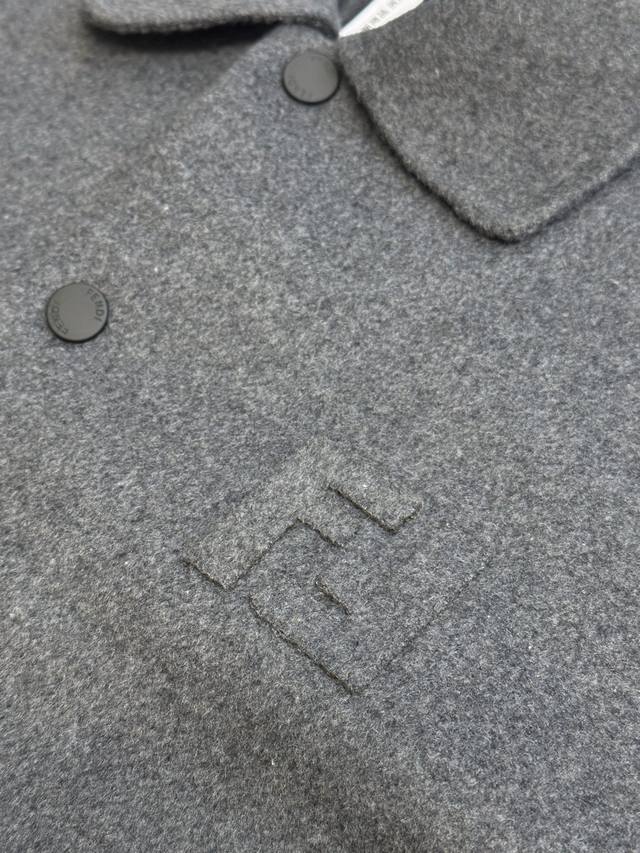 Fendi Ff Embossed Wool Jacket DDD. Made from custom-made luxurious double-woven cashmere and silk fabric, this jacket features a sophisticated smoky gray tone, exuding a beauty that blends the ruggedness and elegance of the fabric. The iconic Ff embossed lettering adorns the chest, while the Ff pattern on the lining holds a unique surprise
