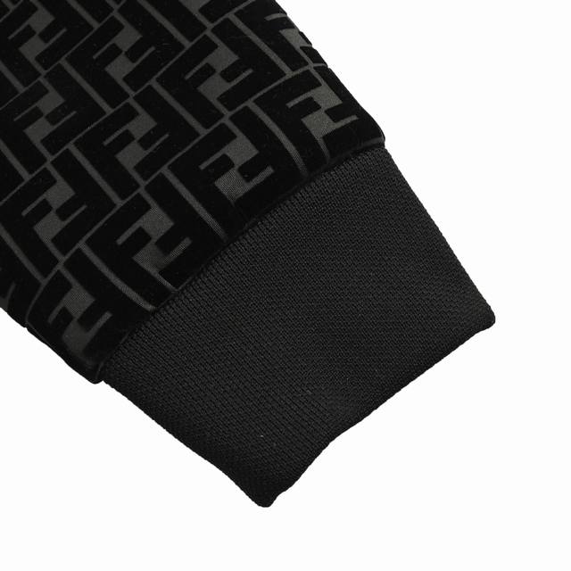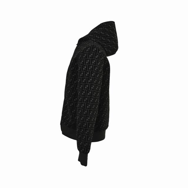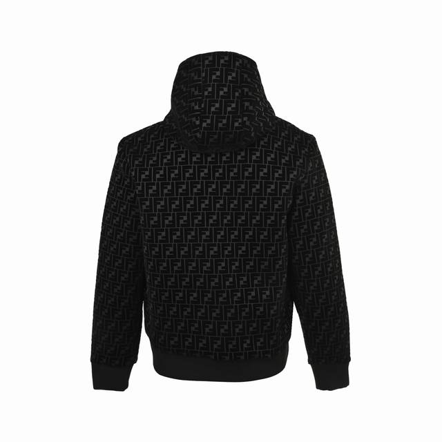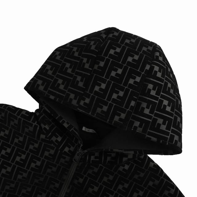 Fendi Ff Flocked Zip-Up Hooded Jacket. Made of plain weave fabric, it is durable and abrasion-resistant. The surface of plain weave fabric is smooth and has good stiffness. Although plain weave fabric is durable and abrasion-resistant, its texture is relatively light and soft. The flocking process uses the principle of electrostatics to vertically and evenly adsorb short fibers onto the adhesive-coated base fabric, forming a soft layer of fleece. This technology not only increases the thickness and warmth of the fabric, but also gives the fabric a unique tactile and visual effect. The fleece has a soft touch and is comfortable against the skin when worn. Size: 46-52.