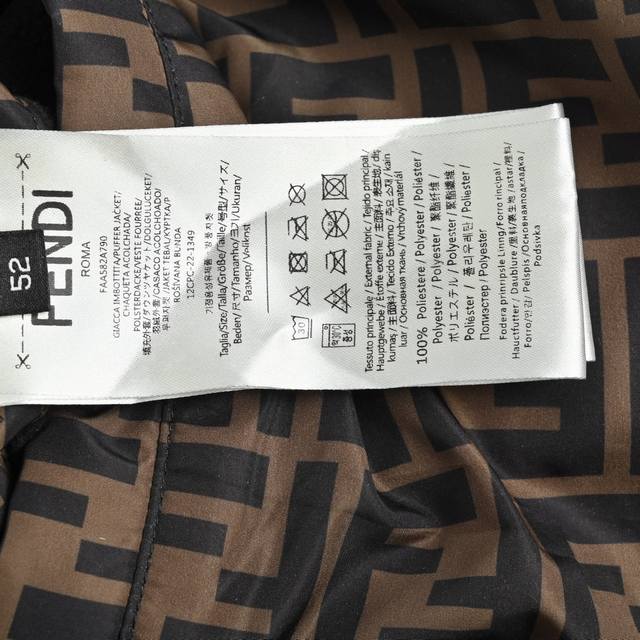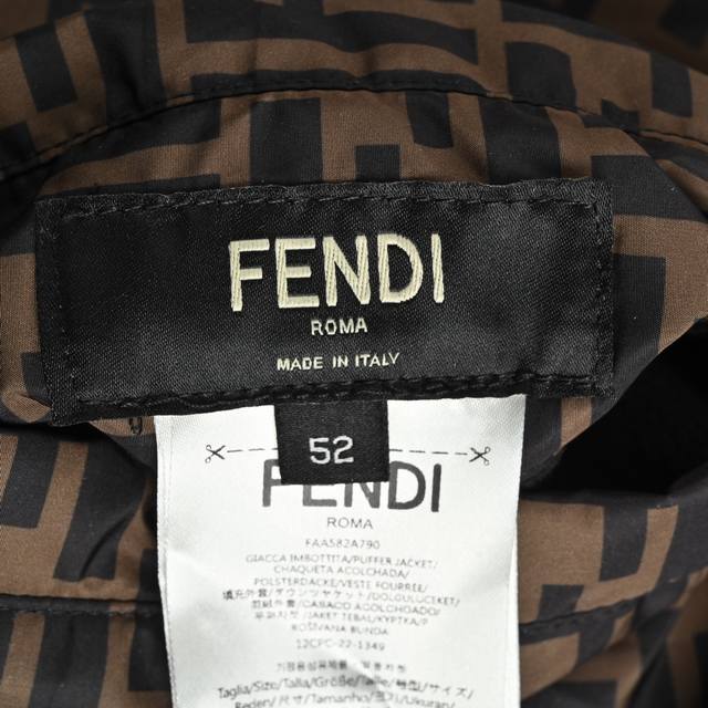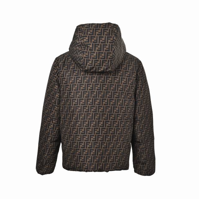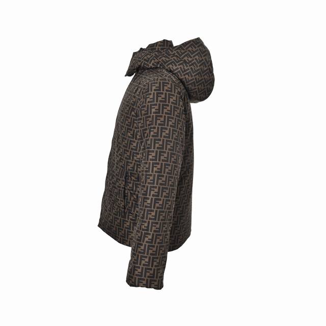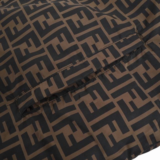 Fendi Ff monogram reversible hooded down jacket. Made with custom high-density calendered nylon fabric and filled with 90% white duck down meeting new national standards, this down-filled jacket is lightweight, warm, and feels as soft as a cloud against the skin. The reversible design features one side fully printed with the classic Ff monogram for a luxurious feel, and the other side with clean, individualistic twill lines. The varying shades of brown suit diverse styles. Computer-controlled precision filling, digital direct-to- garment printing, and laser precision tailoring, combined with neat stencil stitching, result in exquisite craftsmanship and a premium feel. Fully custom 1:1 Fendi accessories. The loose fit includes a detachable and adjustable hood. Size: S-XL