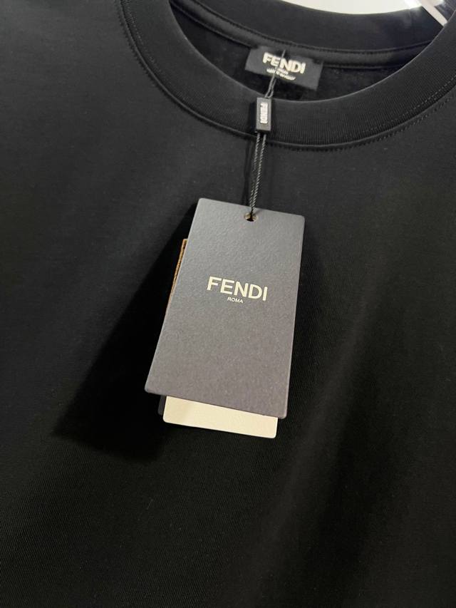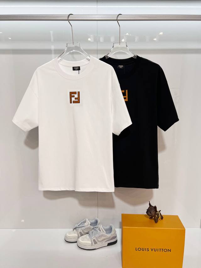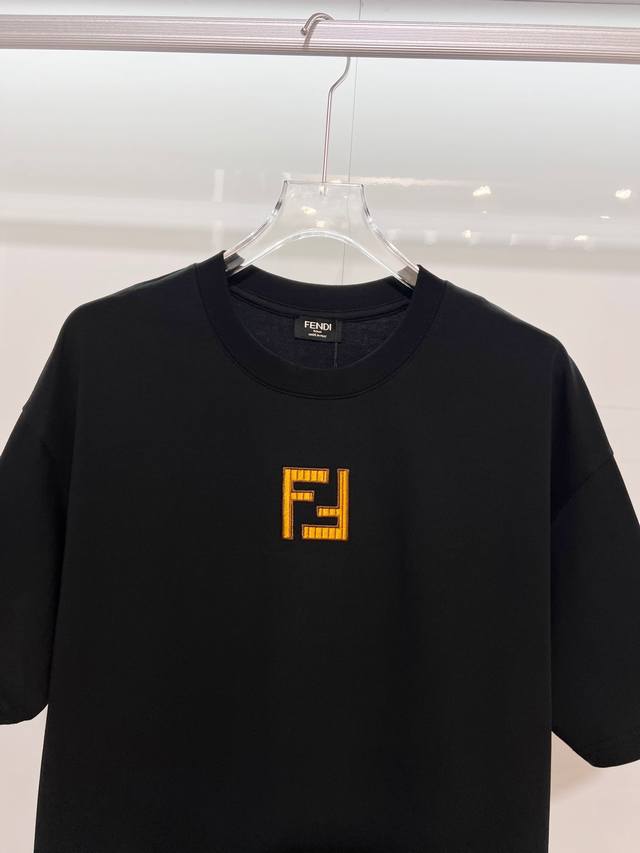 Fendi High-Quality 320g Crew Neck Short Sleeve T-Shirt. Features the brand's classic, simple double-F embroidered logo on the chest. 2026 Spring/Summer official version, high quality, fashionable, versatile, and trendy. Made with original fabric and tags. Includes hangtags, neck labels, and wash labels. Colors: Black, White. Sizes: S, M, L, XL.