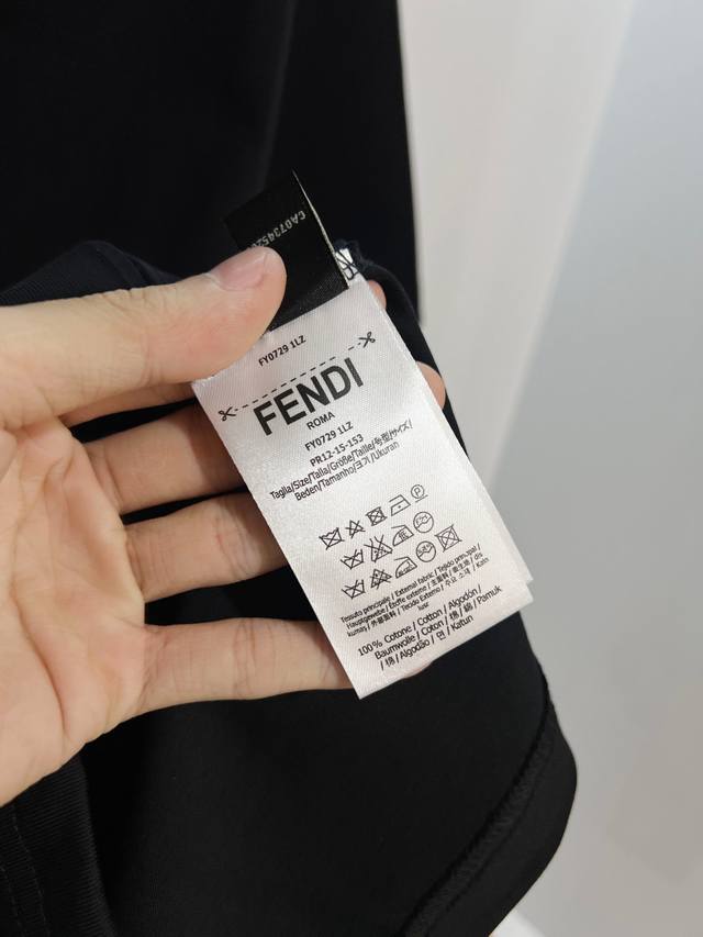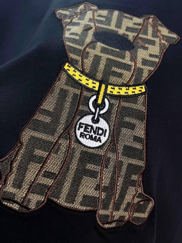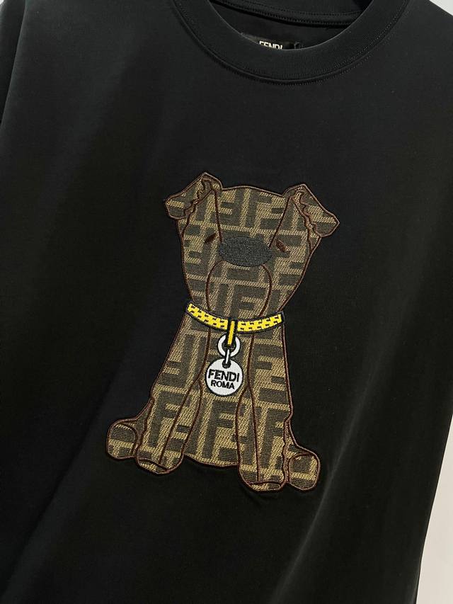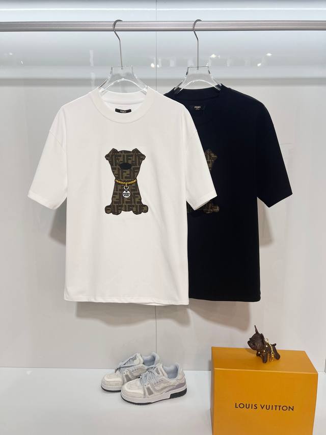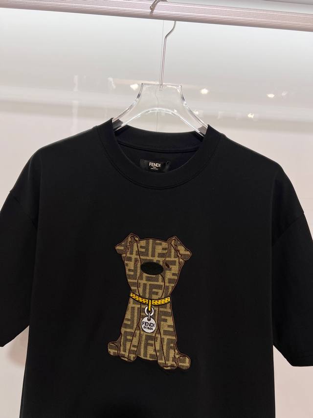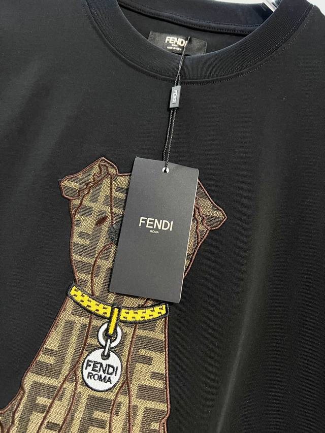 Fendi High-Quality 320g Crew Neck Short Sleeve T-Shirt, featuring classic brand patchwork double F puppy embroidered logo, 2026 Spring/Summer official synchronized high-quality version, fashionable, versatile, trendy, original quality fabric, complete with hangtag, neck label, wash label, and three tags. Colors: Black, White. Sizes: S, M, L, XL.