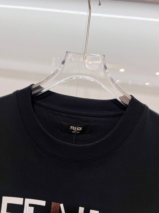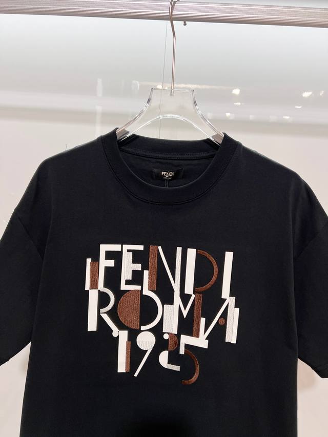 Fendi High-Quality 320g Crew Neck Short Sleeve T-Shirt, featuring classic color-blocked embroidered letter logo and kitten design. 2025Ss Official Synchronized High-Quality Version. Fashionable, Versatile, and Trendy. Made with original quality fabric. Includes hangtags, neck labels, and washing instructions. Colors: Black, White. Sizes: Xs, S, M, L.