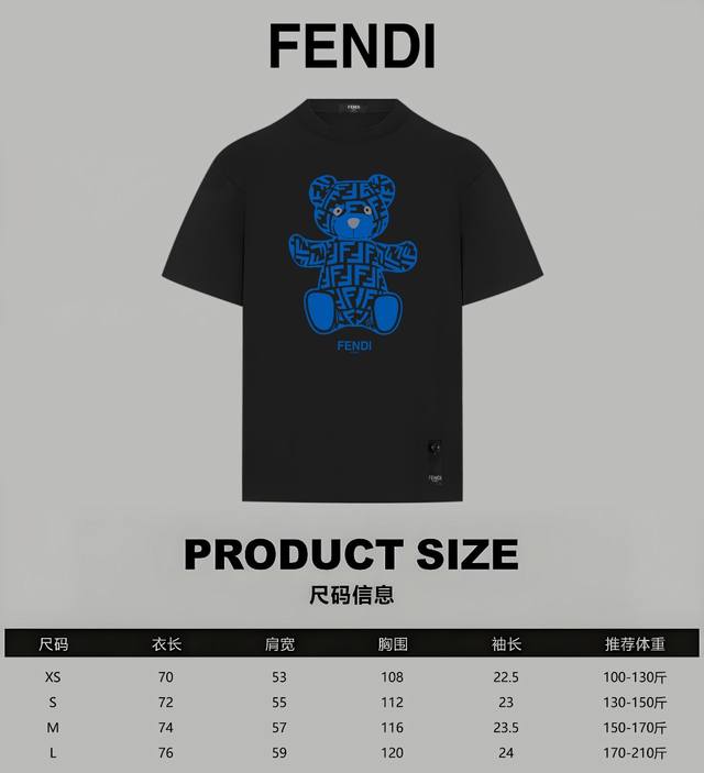 Fendi Official Website Limited Edition All-Over Print Bear Logo and Letter Print Double Yarn Pure Cotton Short-Sleeve T-Shirt - 280G Double Yarn Pure Cotton Top-Grade Fabric, Soft to the Touch, 100% Pure Cotton, Exclusive Shipment, Custom Dyed, Sulfur-Dyed Black, Dust-Free Processed Fabric - Fabric: 280G Double Yarn Pure Cotton Short-Sleeve T-Shirt, Matching 300G Pure Cotton Ribbed Knit - Exquisitely Upgraded Logo Label, Inspired by 80s Retro - Original Fabric, Official Same Style - Colors: White, Black - Sizes: Xs, S, M, L - Purchased from the original and molded, with a full set of custom accessories; details determine success. Accessories: 1:1 original accessories, complete with three labels, Os drop shoulder fit, unisex, official website quality - No gender distinction, unisex style.