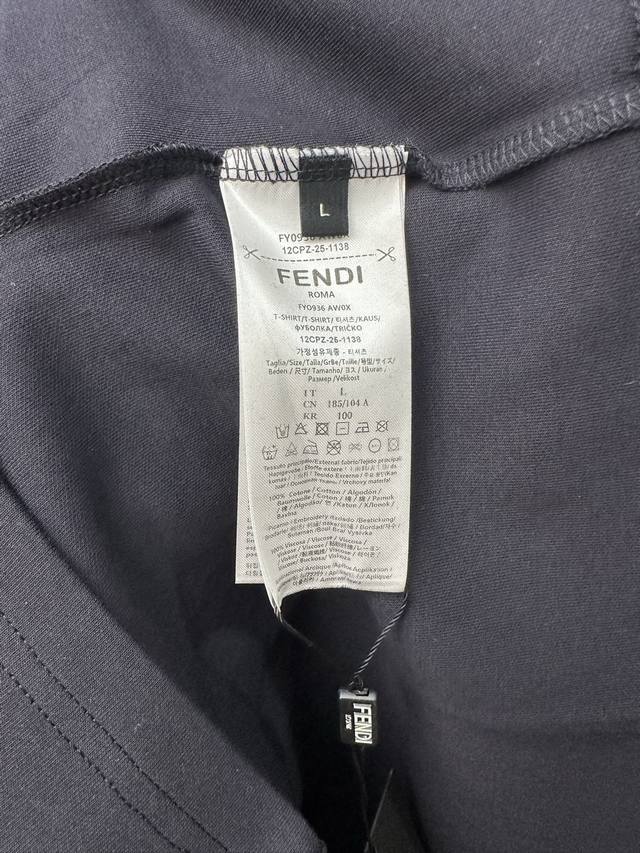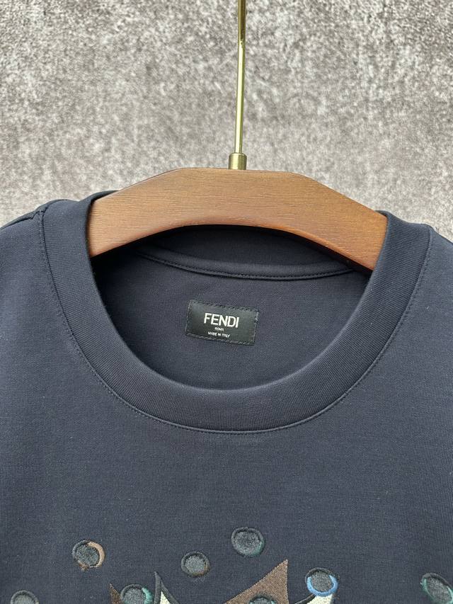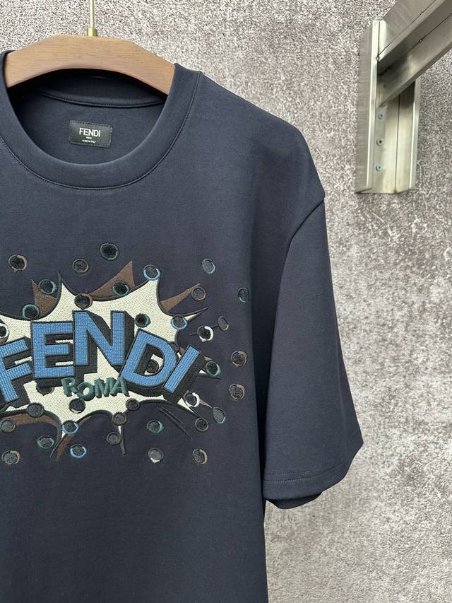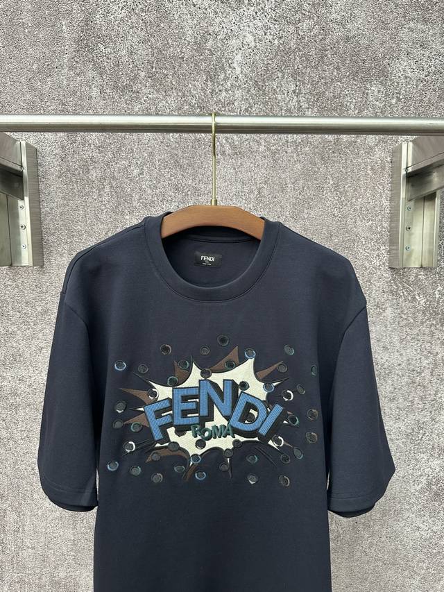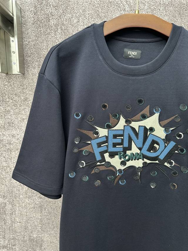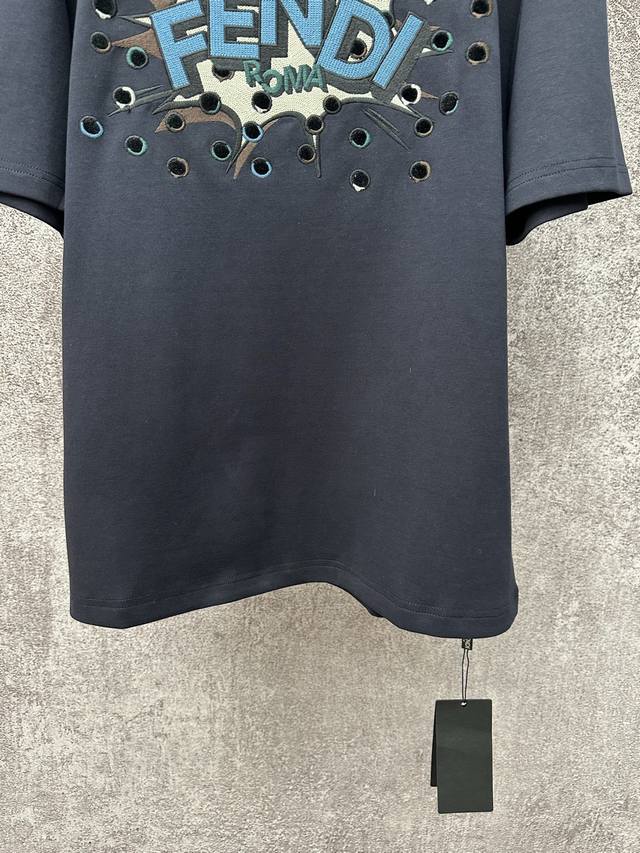 Fendi SS26 Early Spring Holiday Collection Perforated Embroidered Crew Neck Short Sleeve T-Shirt DDD Made of 32-count single-yarn double-sided fabric, 270g/m?. 32-count yarn is a medium-high count, giving the fabric a delicate and smooth feel. The single-yarn double-sided structure of the fabric has a similar smooth appearance and feel on both sides, with a dense texture. The weight is heavyweight, giving the T-shirt excellent crispness, drape, and durability. DDD # Custom color-blocked Boompop pattern embroidered on the front Ddd The Fendi Boompop pattern on the front uses a composite technique combining appliqu