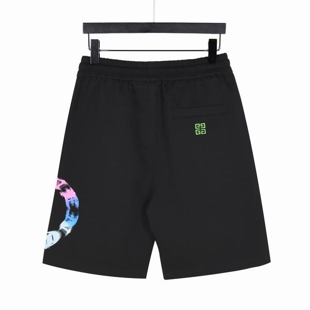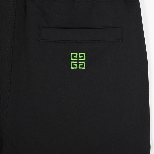 Givenchy shorts with printed logo and embroidered pocket label. Made from cotton terry cloth, these shorts feature a premium two-tone color blocking design. The custom fabric uses a wafer weave and advanced knitting techniques. The print utilizes a fine-mesh plastisol printing process with a fixed color base. The fit is tight and structured. The custom drawstring hardware is high-quality, smooth, and comfortable to wear. The style is simple yet sophisticated, offering excellent breathability and comfort. The details are impeccable, incorporating brand elements and design concepts to reflect high quality. The fabric is soft and delicate to the touch. The casual cut and fit are superb. Color: Black. Size: Xs-L.
