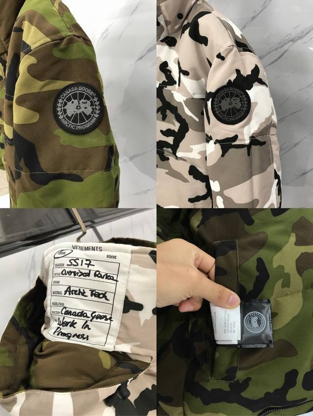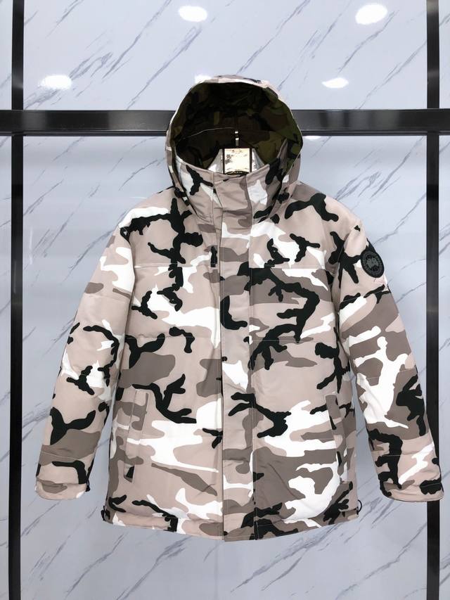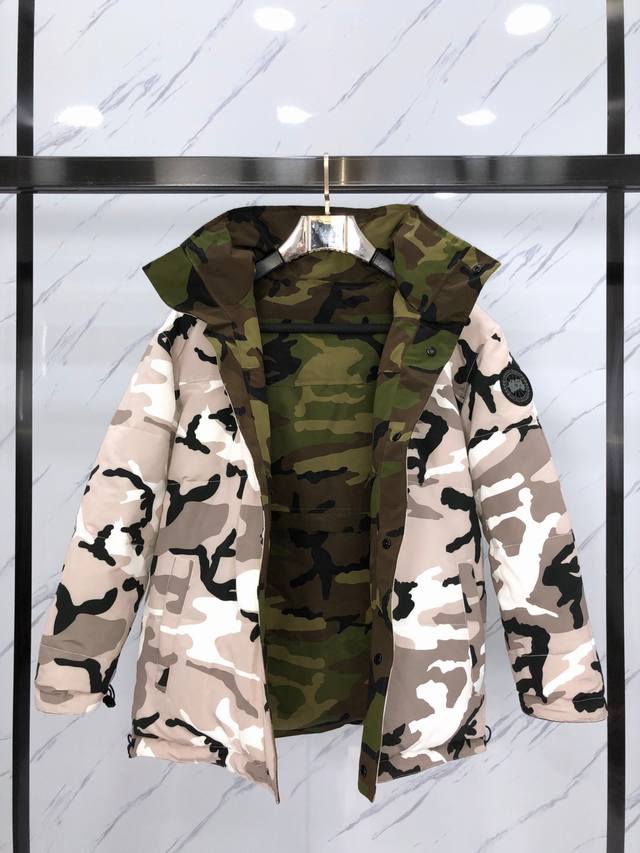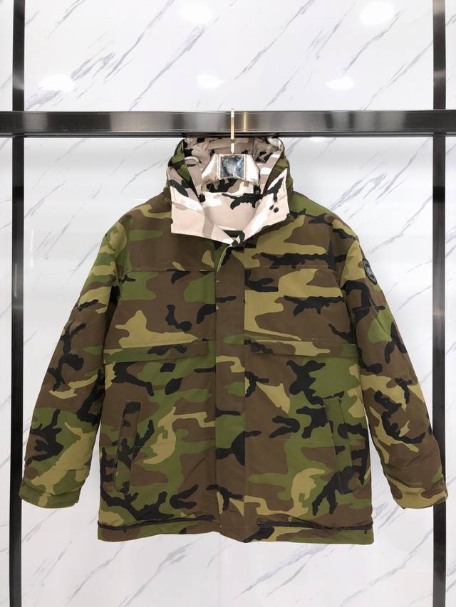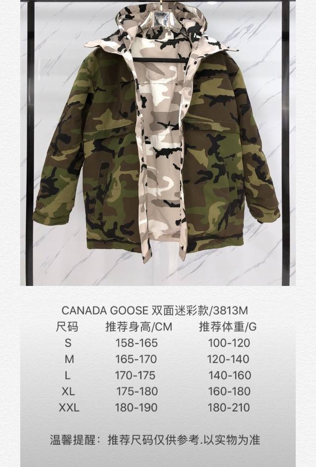 Style: Canada Goose Reversible Camouflage for Men and Women. Factory Direct: Available through global purchasing agents, WeChat merchants, brick-and-mortar stores, Tmall, high-end stalls, and studio partnerships. Free shipping available. G-Dragon, Kris Wu, Victoria Song, and many other celebrities sport the Vetements x Canada Goose Reversible down jacket in green and white camouflage. Oversized. This year, the fabric, down, and trims have been fully upgraded. This limited-edition, unisex style is available. Arctic and Antarctic expeditions choose Canada Goose for their cold-weather gear, making it the Rolls-Royce of down jackets. Industry-leading anti-counterfeiting chip sensor. Custom embroidery labels are custom-made on imported Behringer embroidery machines, exceeding industry standards. Imported Korean 21s polyester-cotton blend fabric with a TC85 waterproof coating for water-repellency, windproofing, and wear resistance. New national standard 80% white duck down with an average fill of 520 grams, an industry-leading fill capacity.