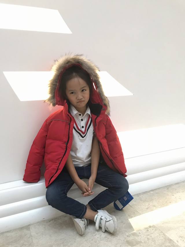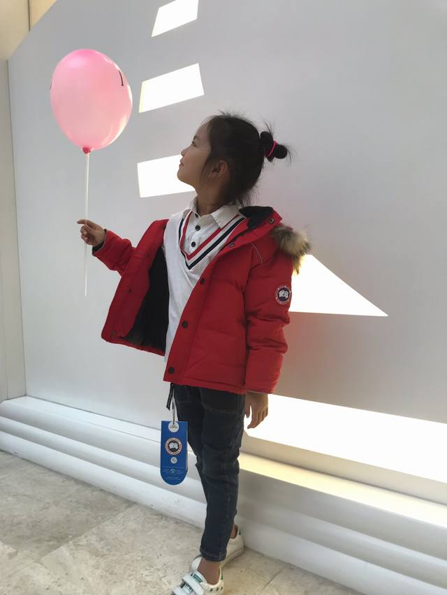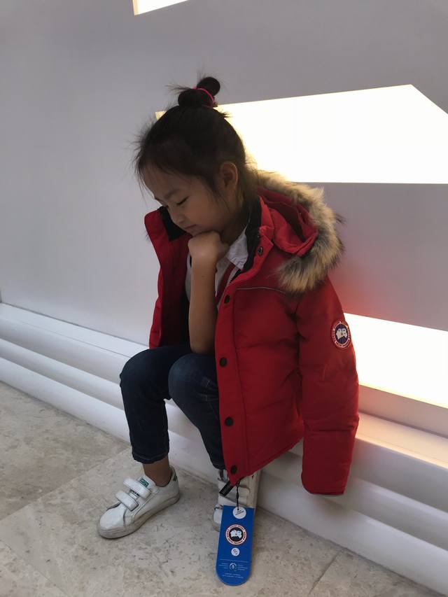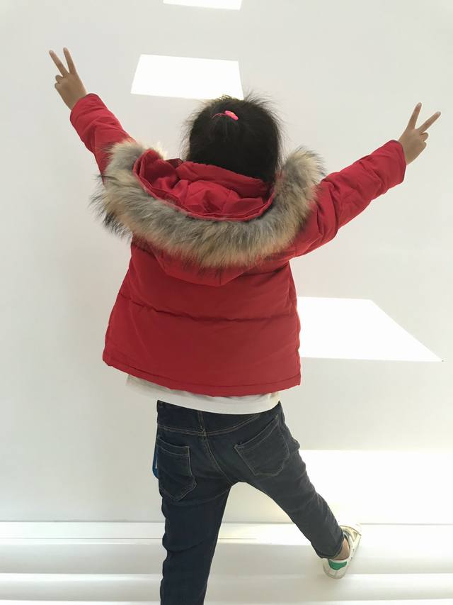Real photos of Goose brand children's down jacket with fur collar. Price: Local sourcing. Style: Goose brand children's hooded down jacket with fur collar. Material: 90% qualified down, 3-layer fabric, colorfast, no down leakage. Color: Red. Size: 110cm-150cm. Unit: cm. Chest circumference, length, sleeve length, shoulder width. 110 40 47 41 32. 120 42 50 44 34. 130 44 53 47 36. 140 46 56 50 38. 150 48 59 53 40.