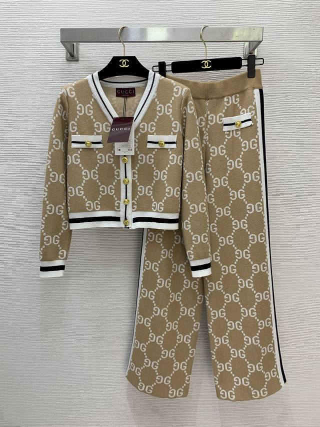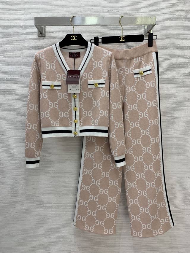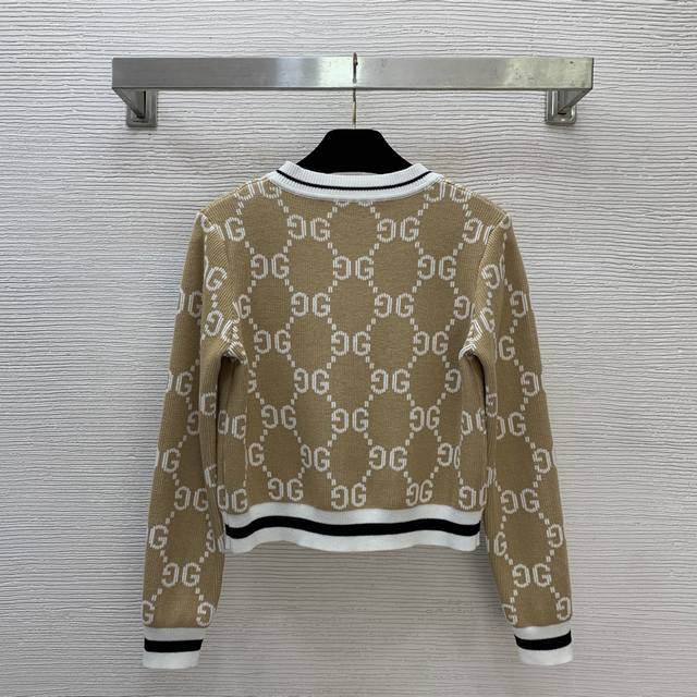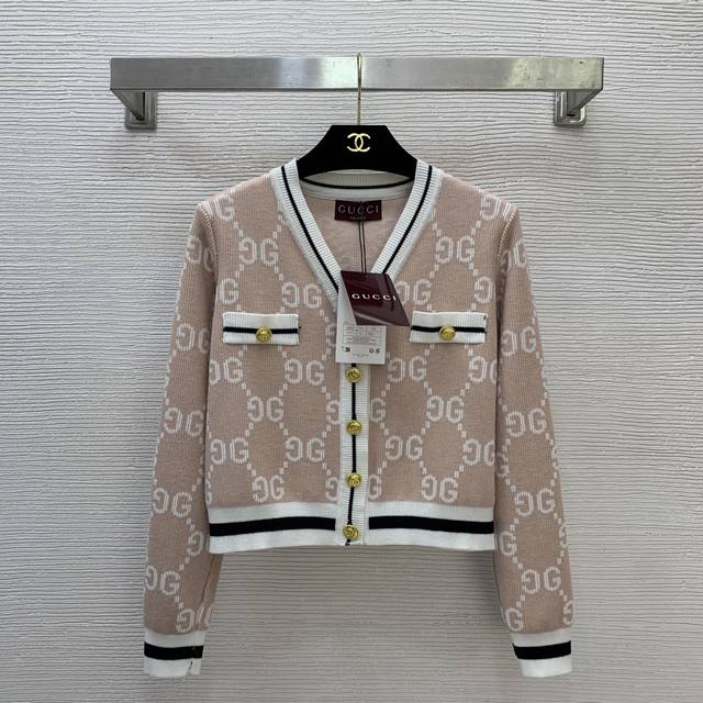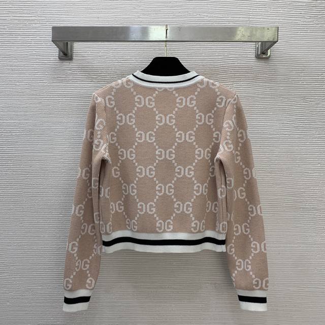 Cardigan Gucc* New Diamond Pattern Gg Letter Jacquard Color Block Striped Short Long Sleeve V-Neck Knit Cardigan Top! Light Pink, Khaki, Size M: Shoulder Width 36cm, Bust 90cm, Sleeve Length 56cm, Length 45cm DDD