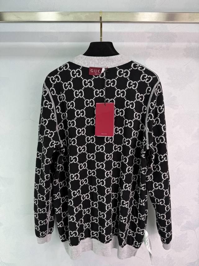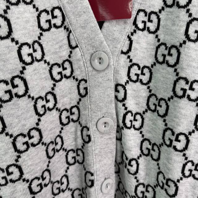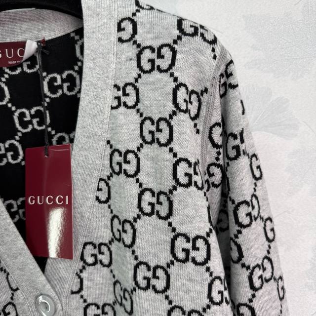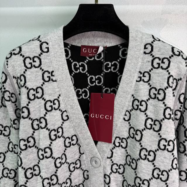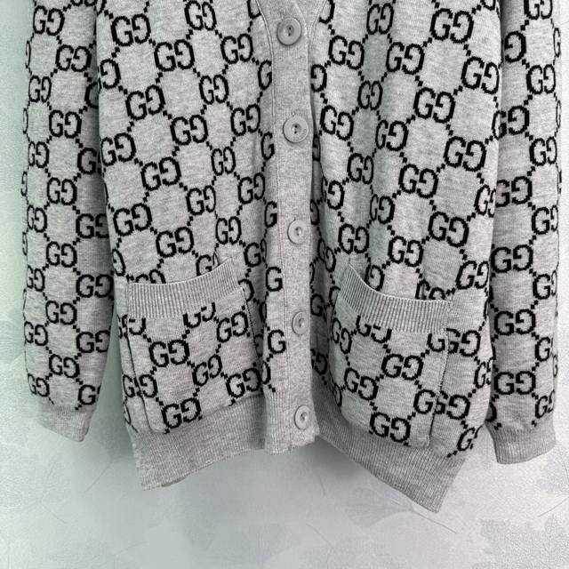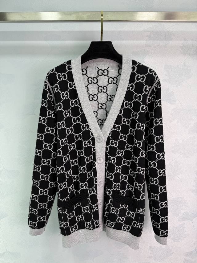 Gucc* 2025 Early Fall new jacquard knit double-faced V-neck cardigan. Custom-made wool knit material, comfortable, soft, and stretchy. V-neck knit cardigan with tailored neckline and cuffs, ribbed hems, and comfortable, stretchy ready-to-wear. Double G contrasting jacquard print accentuates the look while adding a cute and playful touch. Regular fit, smooth, accommodating, and stylish. A must-have for fall and winter fashion! 1 color, 3 sizes Sml