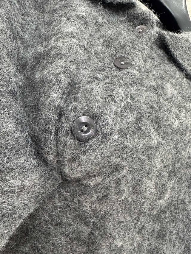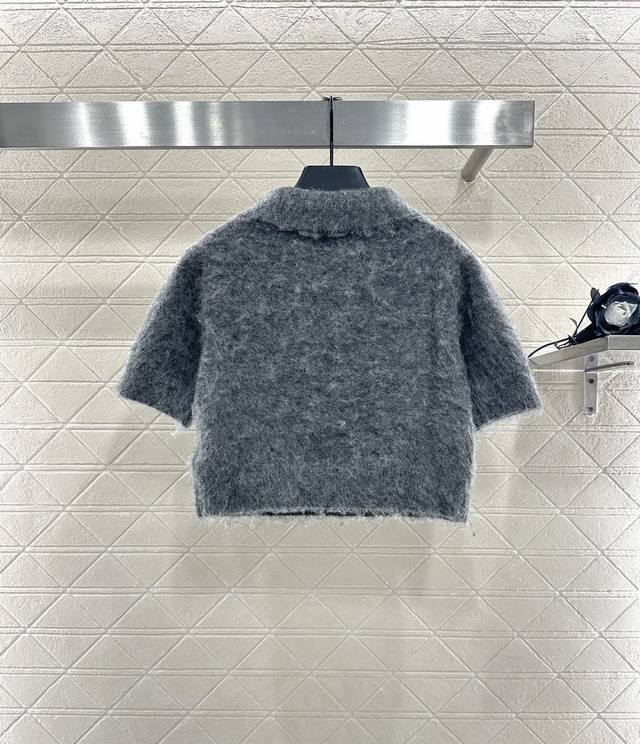 Half-Open Collar Knit Top. Made with custom Yb mohair and wool yarn, this top boasts a high-quality feel, is incredibly soft and comfortable. It features a turn-down collar and structured shoulders, a half-open button design, and a fine, dense texture. All edges are ribbed for a secure finish. It's highly stretchy. The wool fabric is clearly visible throughout, with a soft, fluffy texture that enhances warmth. The round buttons with the logo add a touch of sophistication. The cropped style is fashionable and chic, suitable for all seasons. Custom fabrics and accessories, look for the high-quality version