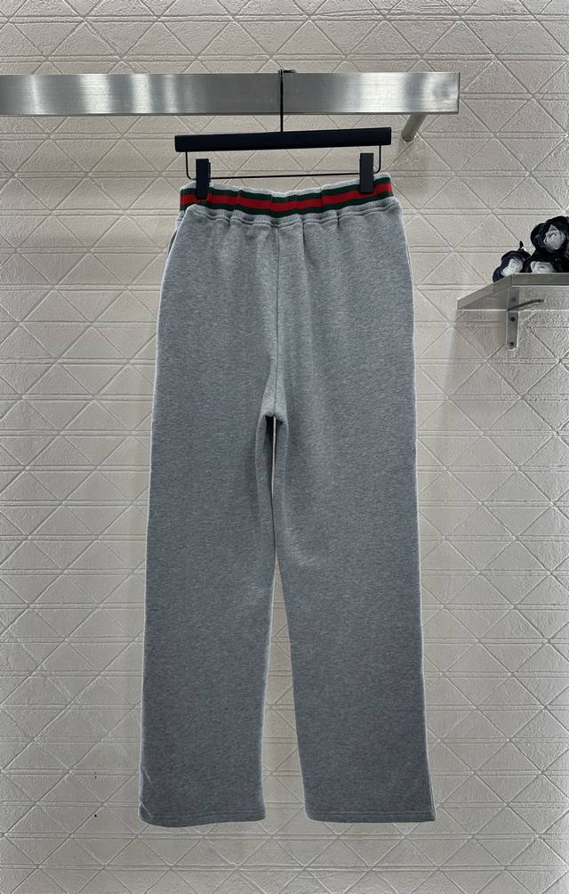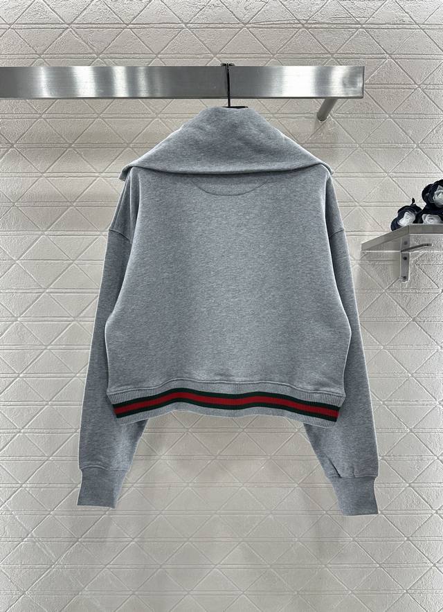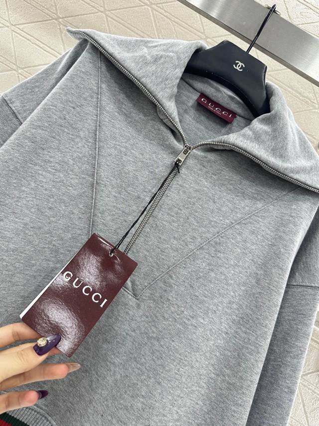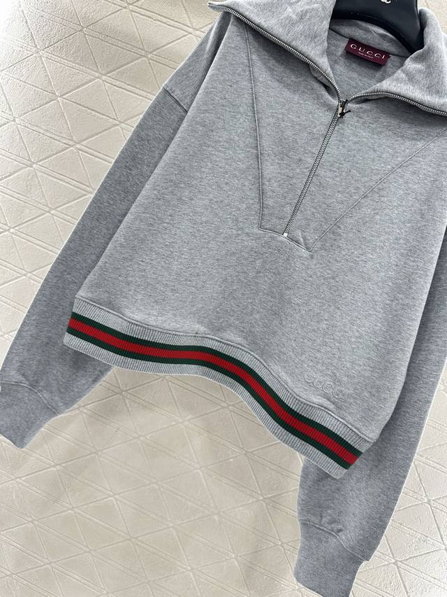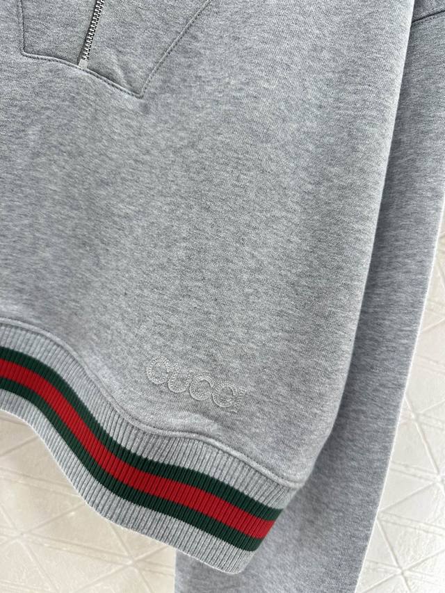 Gucc* 2025 New Arrival DDD Oversized Collar Sweatshirt and Pants Set DDD Made of custom Yb original pure cotton, soft and skin-friendly, with a delicate sheen, comfortable and warm to wear, and not easy to pill or deform. The oversized collar sweatshirt features a half-zip design, fashionable and relaxed, with outline stitching on the chest for added texture, and contrasting red and green ribbon at the hem, embroidered lettering for a stylish look. Paired with matching drawstring wide-leg pants, the waist is adorned with the brand's signature red and green ribbon embroidered logo, showcasing a high-end style. The overall look is coordinated and fashionable, a must-have versatile set for all seasons. Custom fabrics and accessories, look for the high-quality version of the sweatshirt and pants DDD