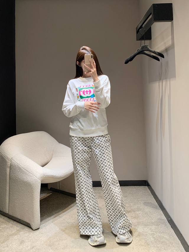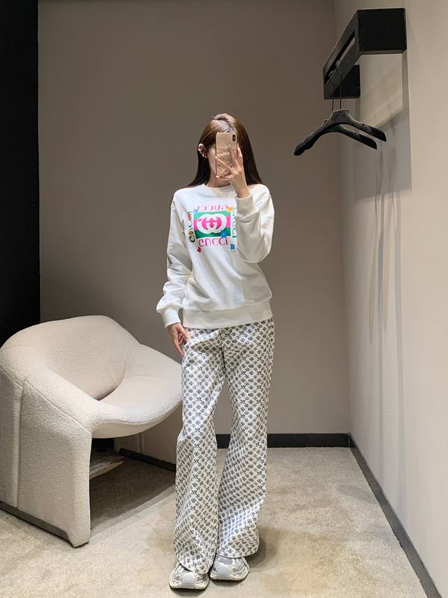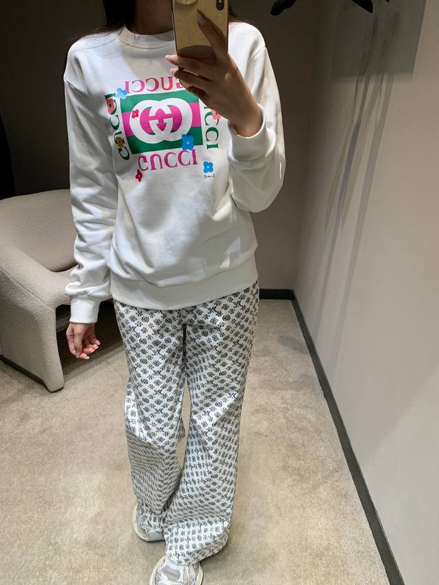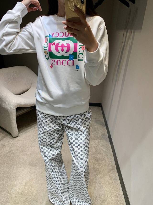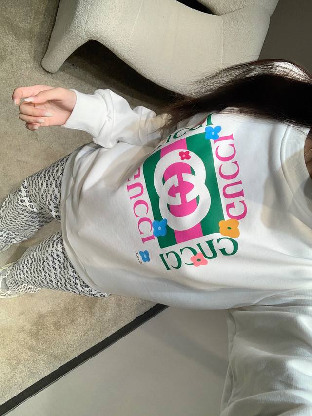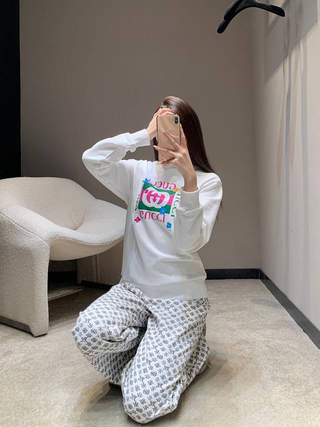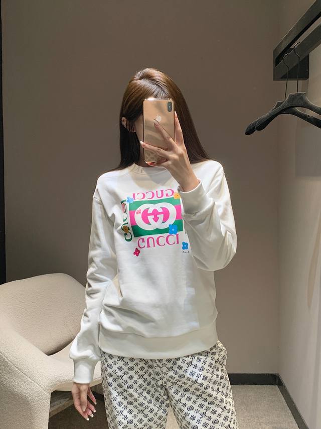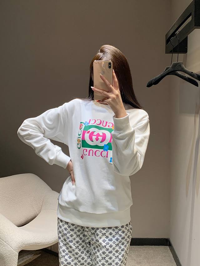 Gucc* 25Fw's new early fall floral and square print crewneck sweatshirt | Exclusive high-top edition! Dropped shoulders, pullover silhouette, and ribbed hem details create a refined and harmonious atmosphere. A three-dimensional lettering embellishment surrounds the chest, along with colorful floral and cartoon elements, highlighting the brand's premium feel. The overall style is understated yet sophisticated, making it a casual yet stylish choice for everyday commuting. Available now: S, M, L, D, D.