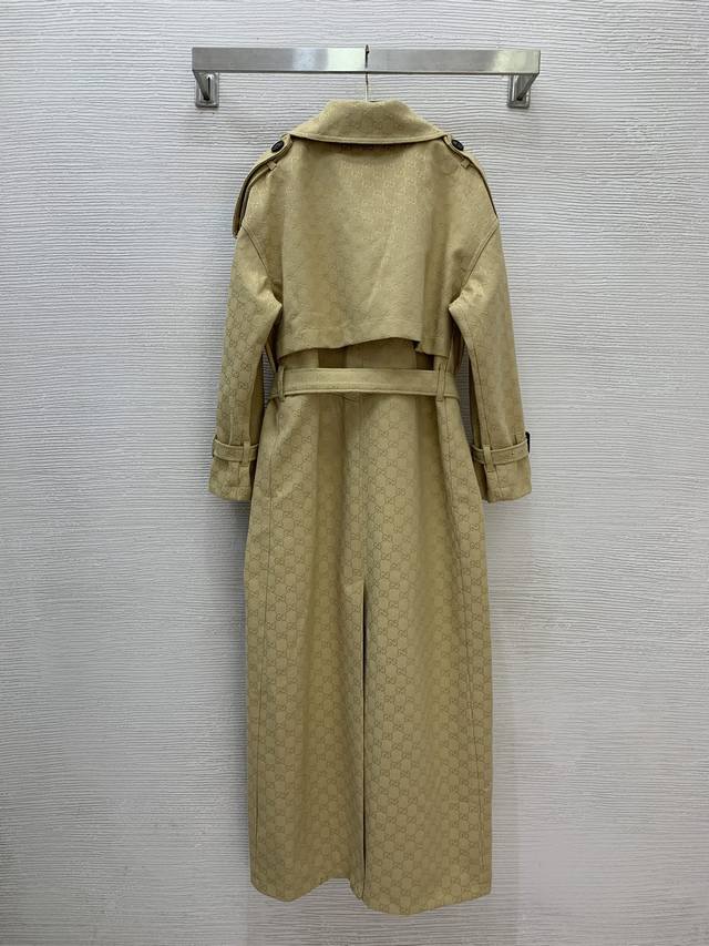 Gucc* New custom GG monogram jacquard fabric, double-breasted lapel, loose and fashionable with a belted waist, long trench coat, thick coat! Apricot color, size M: Shoulder 54cm, Chest 114cm, Sleeve 48cm, Length 135cm
