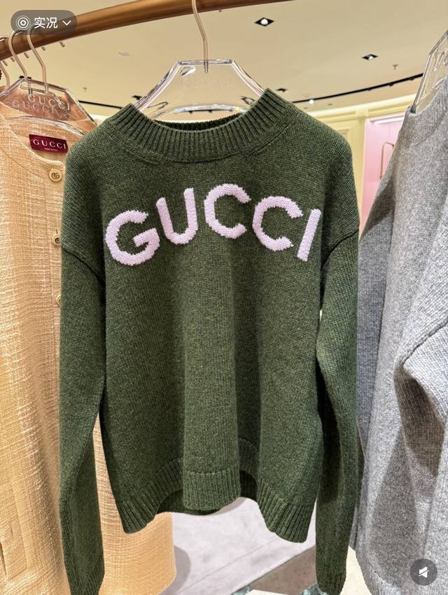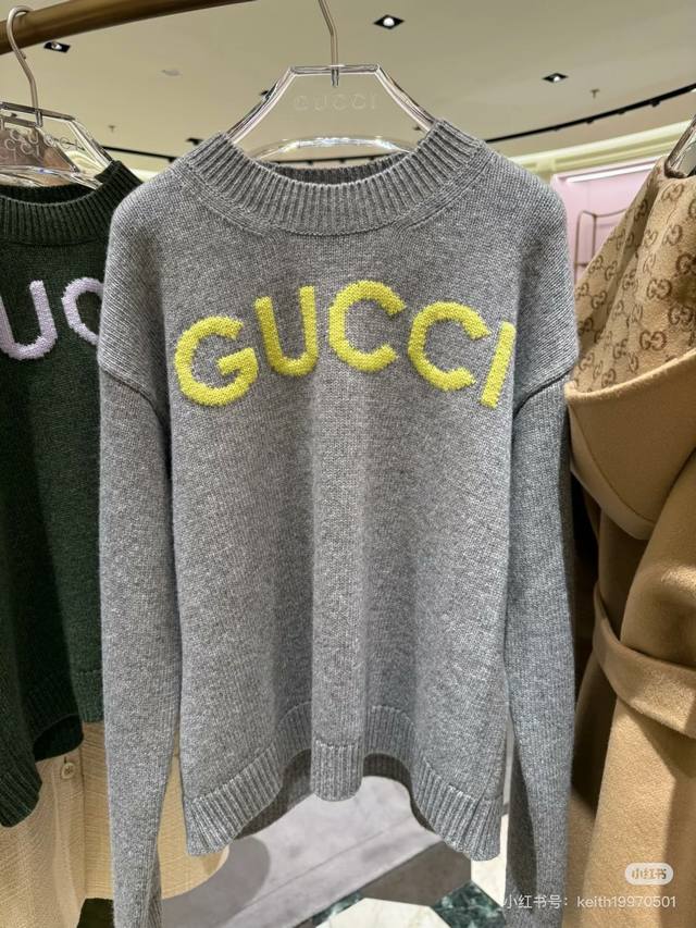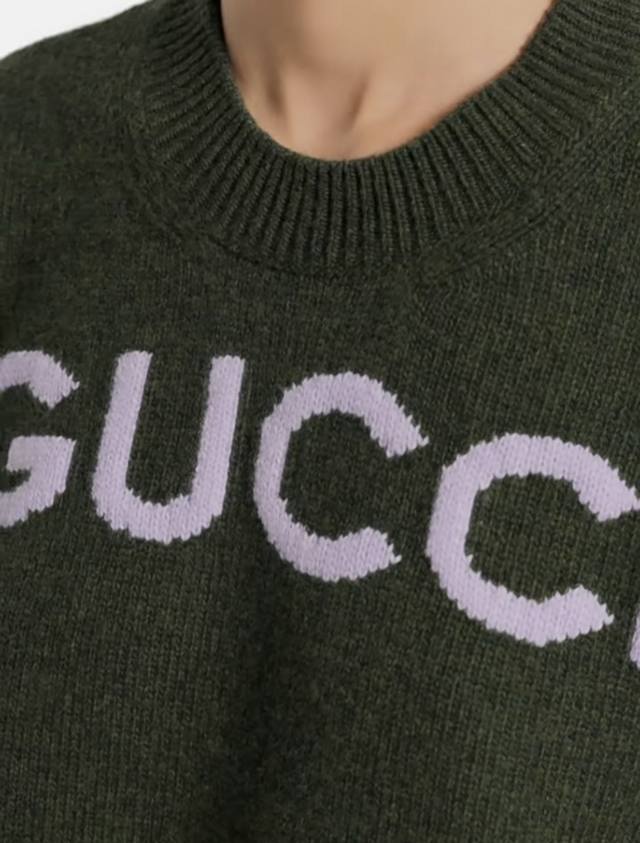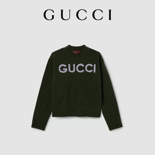 Gucc* New high-end custom 100% wool yarn fabric, stylish and versatile pullover long-sleeved knit top with letter logo on the chest! Green, gray, Size M: Shoulder width 44, Bust 90, Sleeve length 55, Length 56 DDD