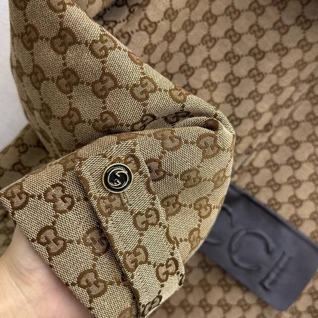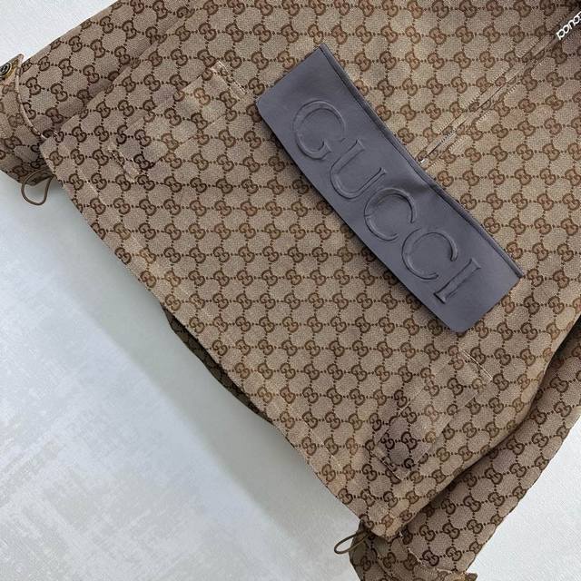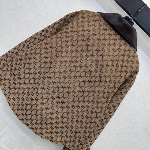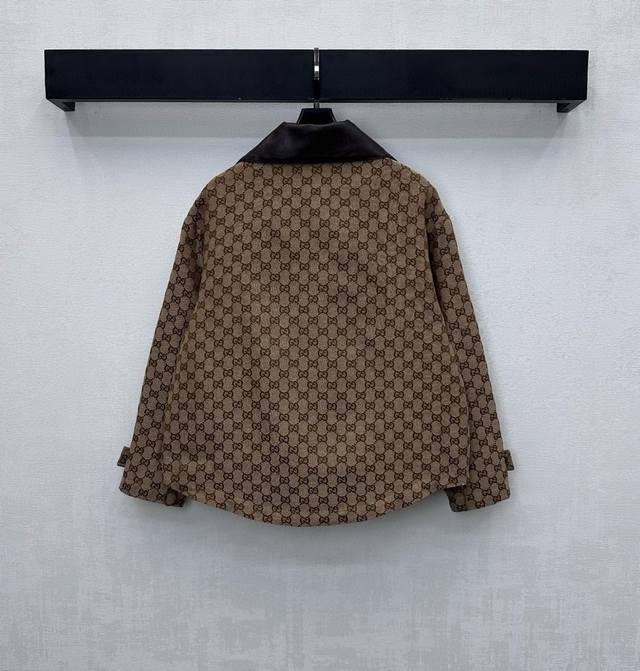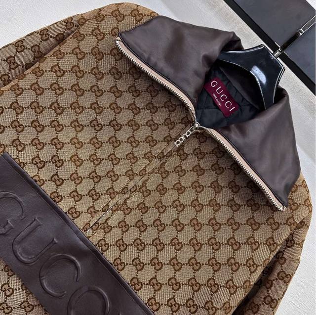 Gucc*2025 New Arrival: Lapel Jacquard Windproof Cotton-padded Jacket (Customized Yb). Made with imported jacquard material, this jacket is crisp and stylish. The diamond-patterned inner lining provides lightweight warmth. The full-coverage brown-yellow double G jacquard pattern highlights the brand's style and trendiness. The contrasting leather collar design echoes the leather lettering on the chest, adding a sense of style and layering. The drawstring hem allows for adjustment and tightening. It is windproof and warm. New materials and accessories have been developed. The loose-fitting design flatters all body types, creating a stylish and eye-catching look. High-quality version available.