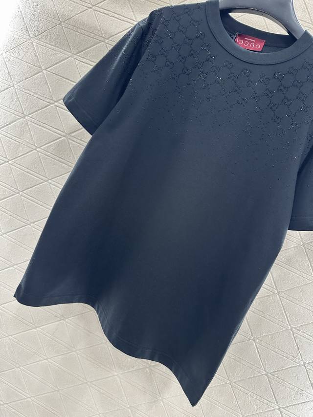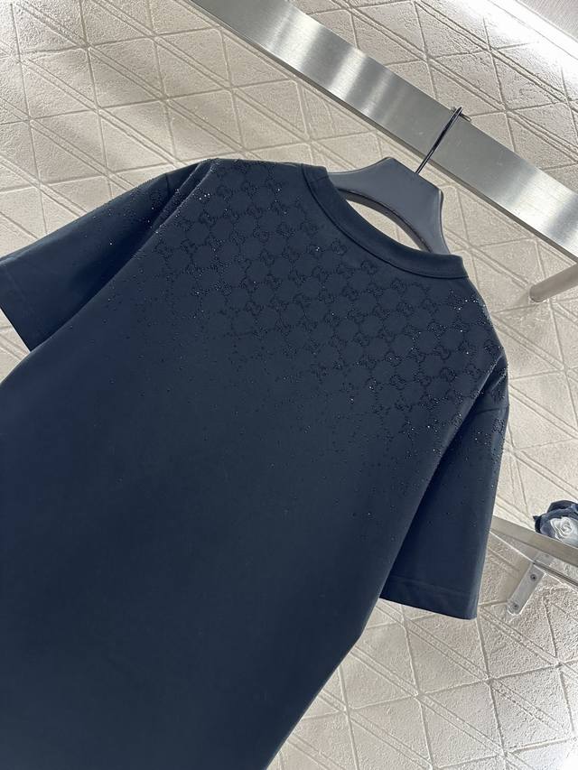 Gucc*2025 New Arrival DDD Round Neck Rhinestone Logo DDD Custom Yb Original 100% Cotton Material, Breathable and Comfortable, with a Rich Texture. Loose Short-Sleeve T-Shirt Cut, Made of High-Grade 100% Cotton, with Excellent Flow and a Slimming and Stylish Effect. The double G logo is arranged in a diamond pattern from the neckline to the chest in a gradient, complemented by rhinestone details to enhance brand recognition. Utilizing light refraction, it instantly exudes a fashionable and sophisticated feel, creating a unique style. Stylish and relaxed, it looks great worn alone or as an inner layer. Customized fabric and accessories, please look for the high-quality black version. DDD