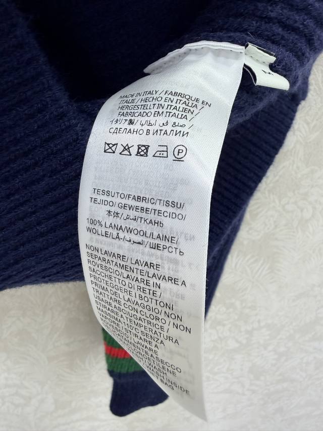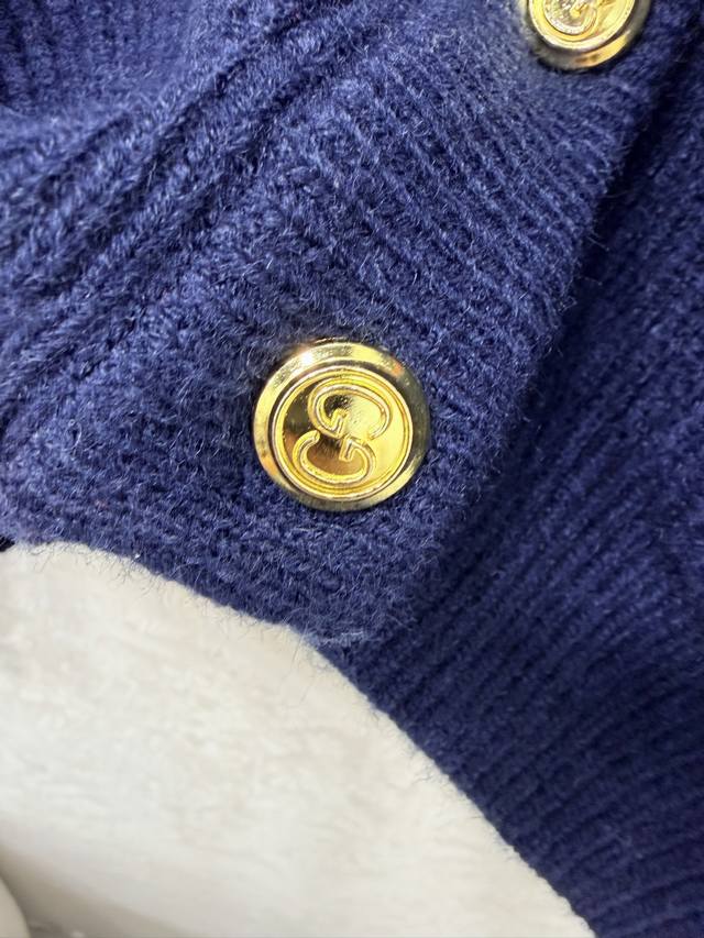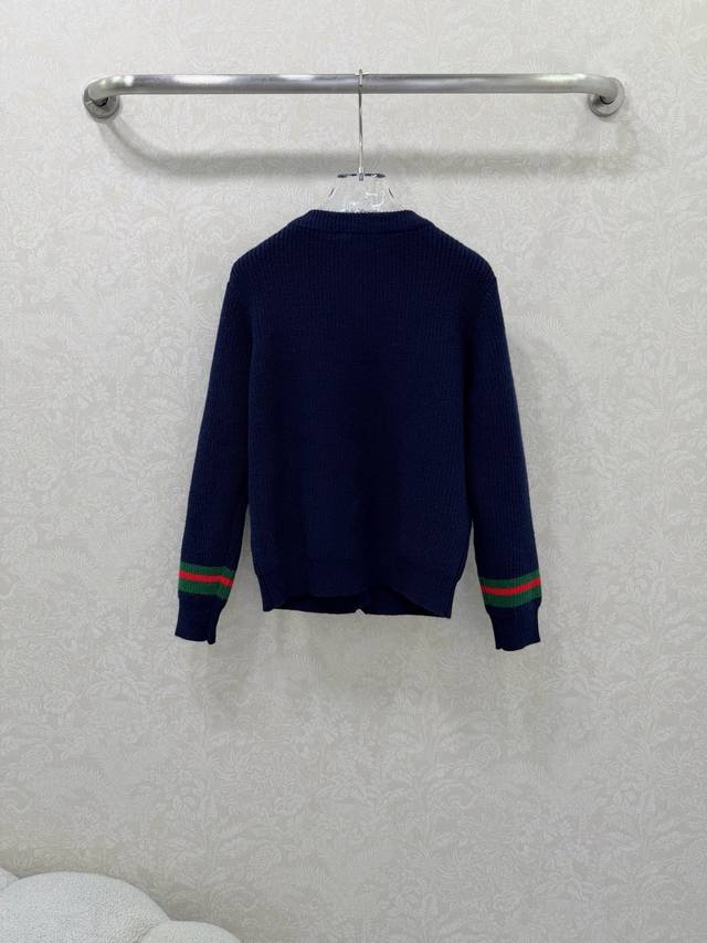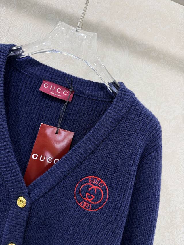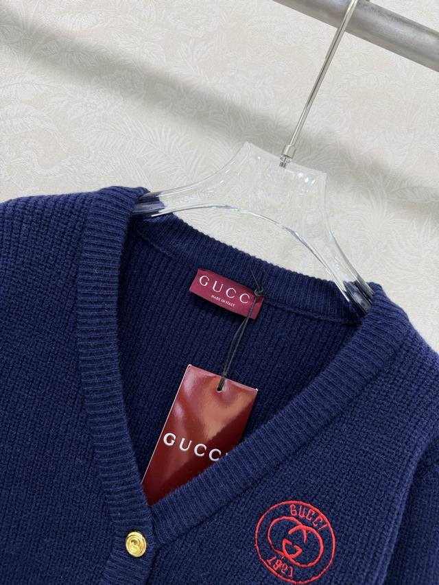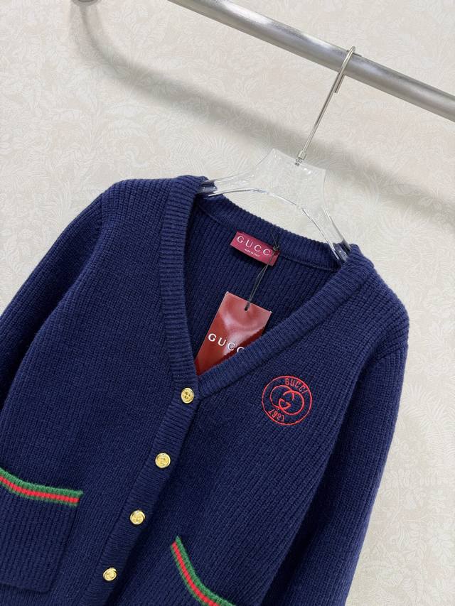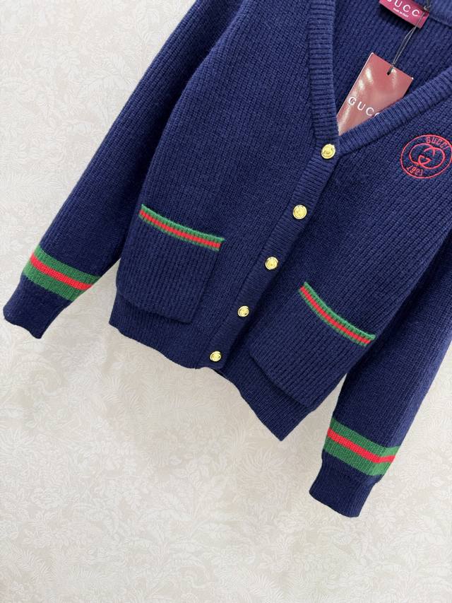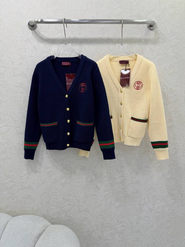 Gucc*25 New Color-Blocked Cuff Knit Cardigan, V-Neck, Single-Breasted, Custom Double G Hardware. Classic design with embroidered pattern on the chest, incredibly slimming! Original custom imported wool yarn, superb texture! Youthful and girly vibe. Elegant and fashionable piece! A must-have for sophisticated women! 2 colors, 3 sizes. Smlb. DDD