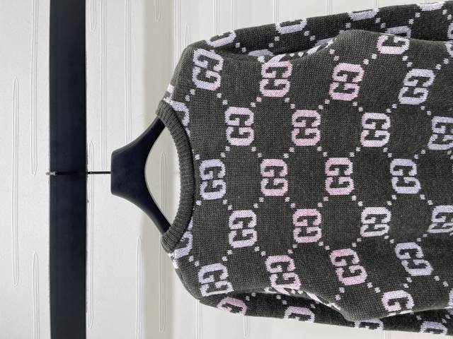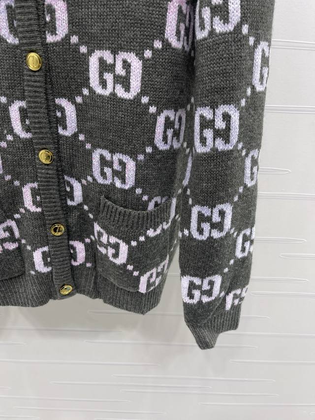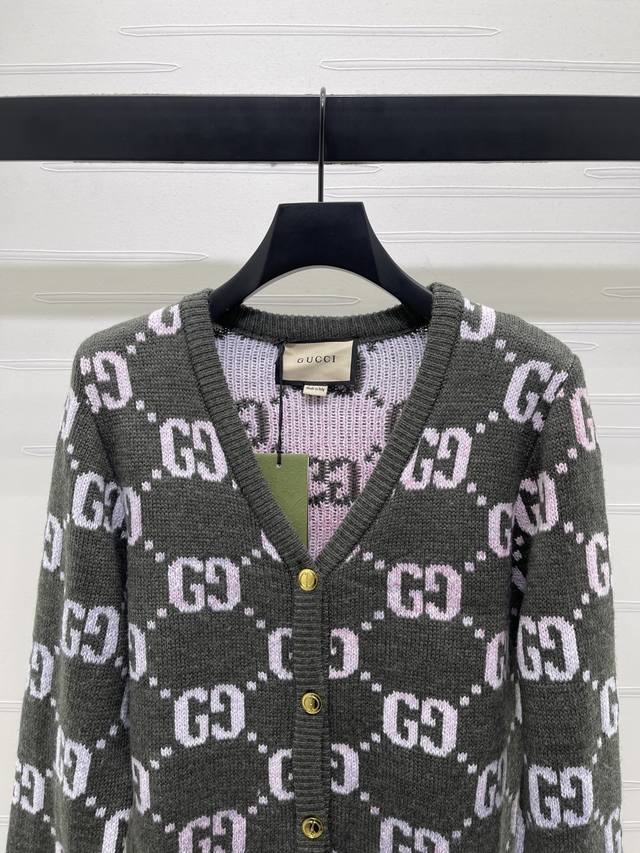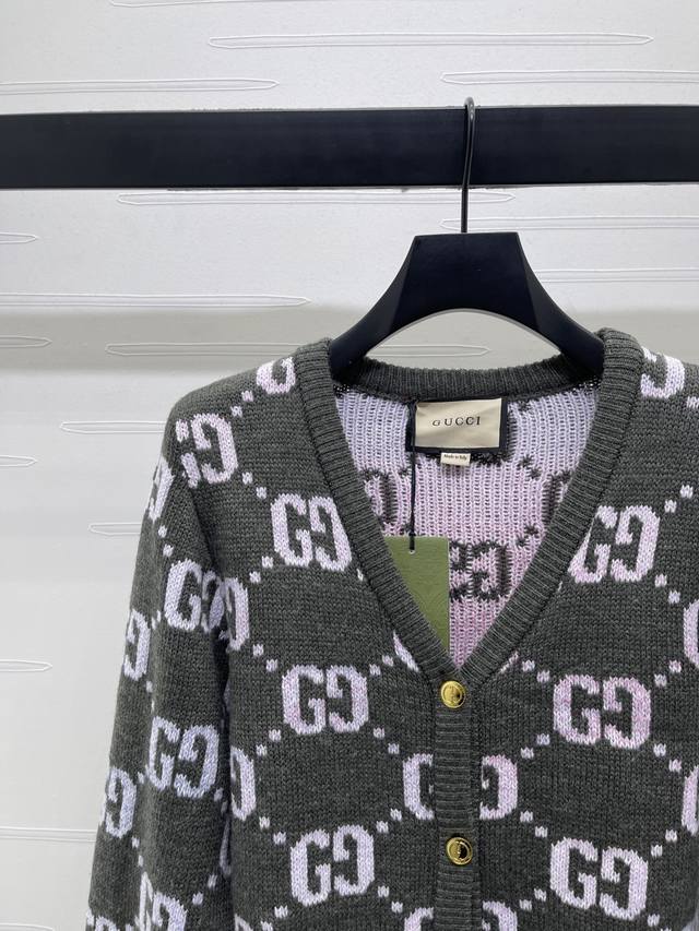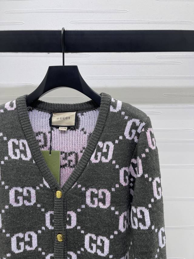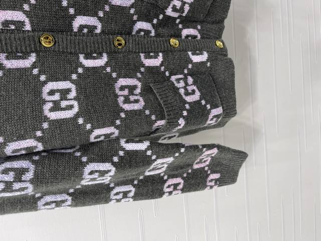 New Arrival! High-Quality Original GUCCC* 2025 Early Autumn Collection! Double GV Collar Jacquard Knit Cardigan! Custom wool blend yarn material, superior webbing texture. The entire cardigan is adorned with a gradient GG jacquard diamond pattern, exuding a strong retro style that is playful, youthful, and flattering. Perfect for everyday wear or casual gatherings! Available in 2 colors! Sizes SM-L3! High-quality bulk order.