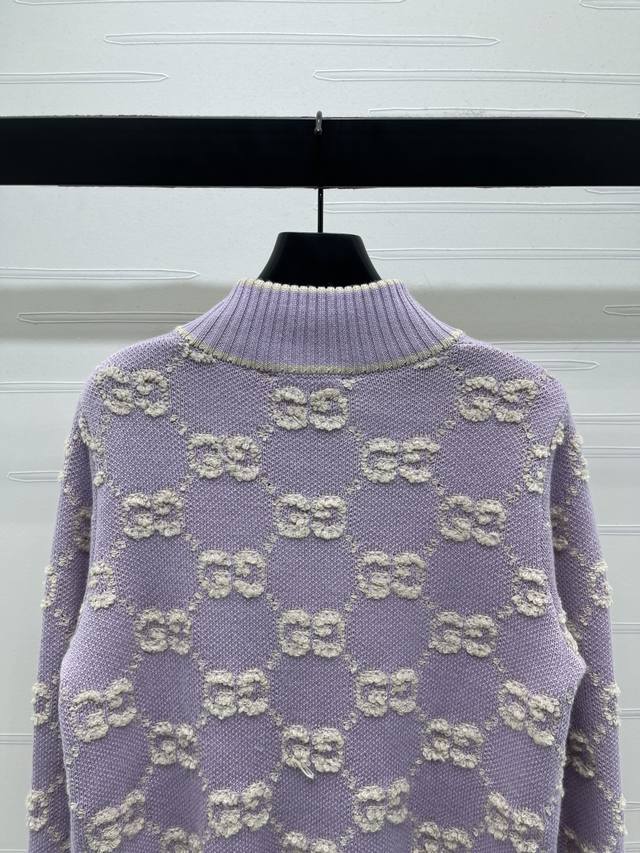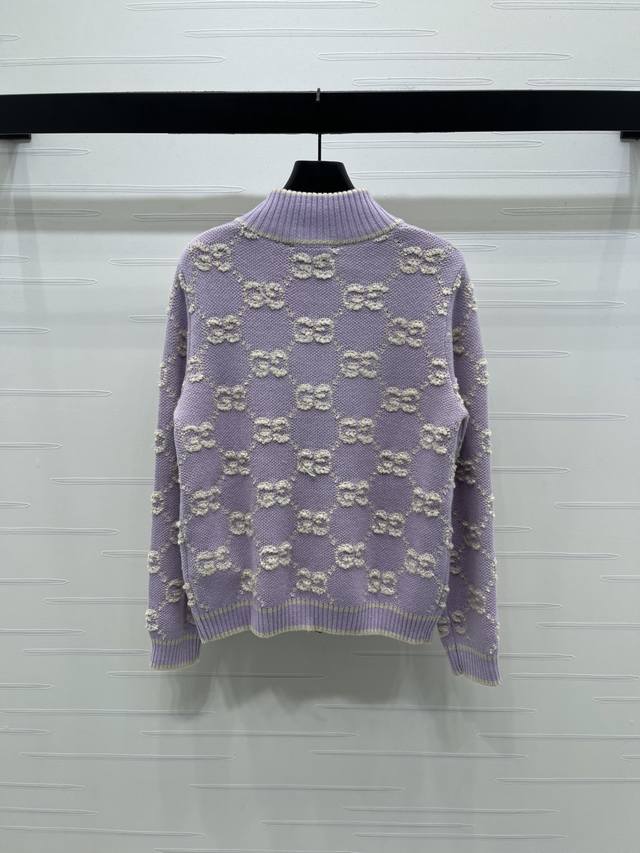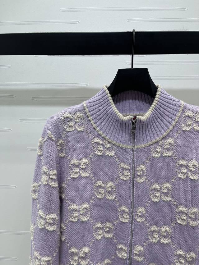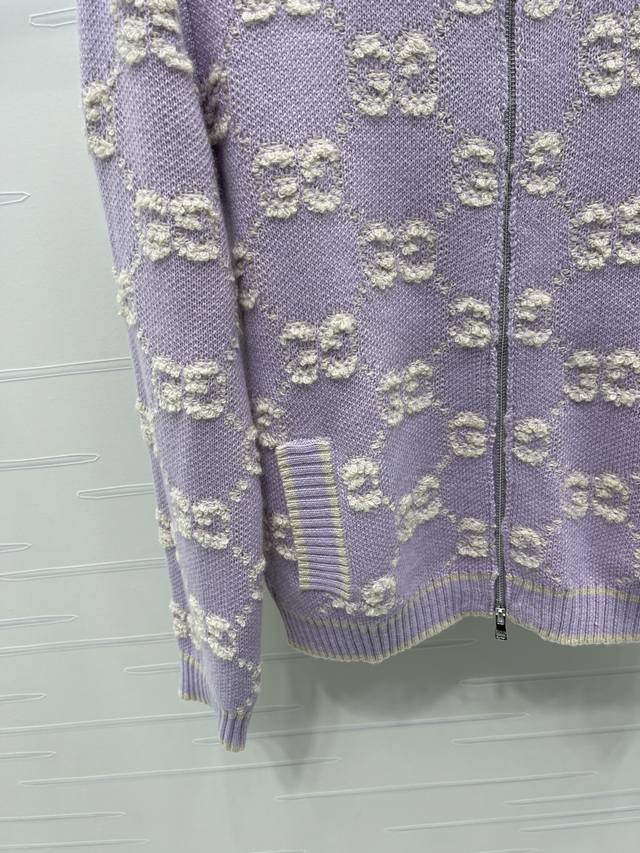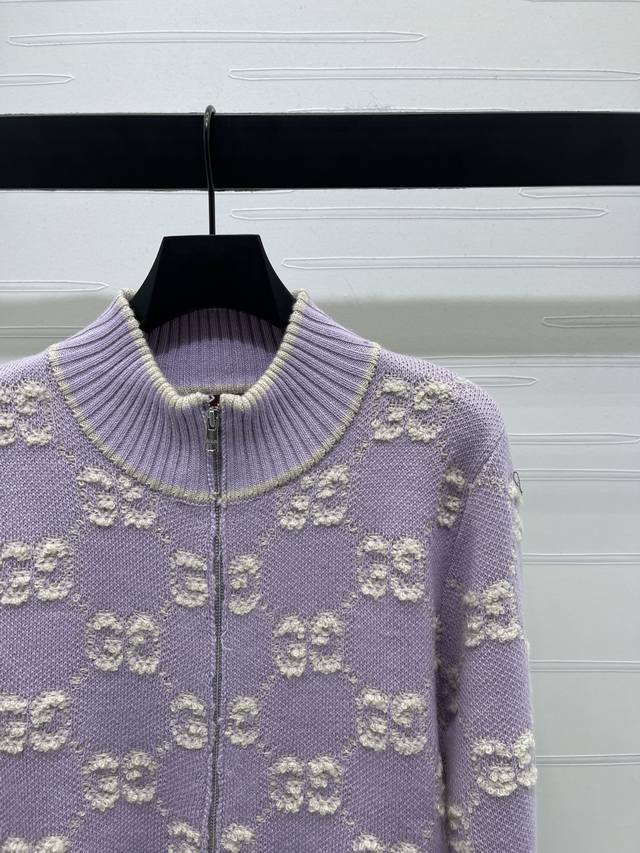 New Arrival! High-Quality Original GUCCC*2025 Early Autumn Collection! Stand Collar Jacquard Knit Cardigan! Made of custom wool knit material with superior texture. The stand collar knit cardigan features a full-open design with a smooth zipper for easy on and off. The garment is finished with striped ribbed trim to narrow the front, maintaining a unified style. The overall silhouette is sophisticated and structured. The double G jacquard pattern throughout is accented with stripes on the trim and upper pocket edges, creating a unique and fashionable look. The engraved buttons add a stylish touch to this classic and versatile piece. A must-have for a relaxed and chic style! 1 color! Sizes SM-L3! High-quality bulk order.