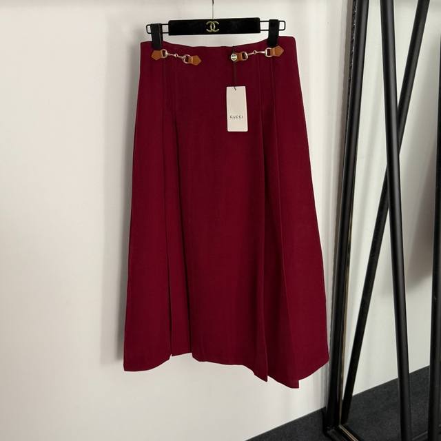 Style No. 20255185 Gucc* new high-waisted pleated mid-length A-line skirt with metal buckle embellishment. Available in off-white, red, or black. Sizes S-Xl, M; Waist 74cm, Length 85cm; Weight: 0.485kg.
